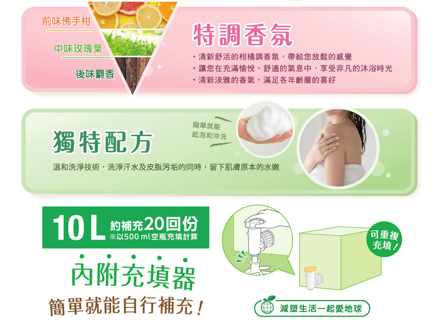| 內容量/入數 | Fiesta 沐浴精 10公升 X 1入 + 充填器 X 1入 |