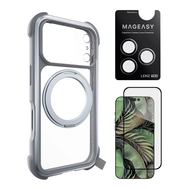MAGEASY Odyssey Stand M 360 Magnetic Stand Protective Case iPhone 17 Pro [Fog] + Lenz Sapphire Camera Lens Protector [Titanium Mist] + Vetro 9H Tempered Glass Screen Protector