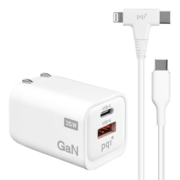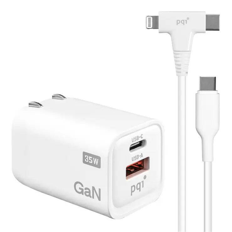 PQI 35W Dual Port GaN PD/QC3.0 Fast Charger with 2-in-1 USB-C to USB-C and Lightning Cable 120 cm