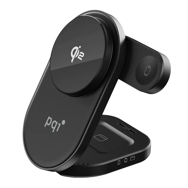- PQI qi2 三合一折疊式磁吸無線充電座通過qi2認証,支援最新qi2無線充電技術,可為 3 部裝置(手機、Qi無線充電功能耳機和Apple Watc)同時充電,配備高品質磁鐵,磁吸力能將您的設備保持在理想位置。