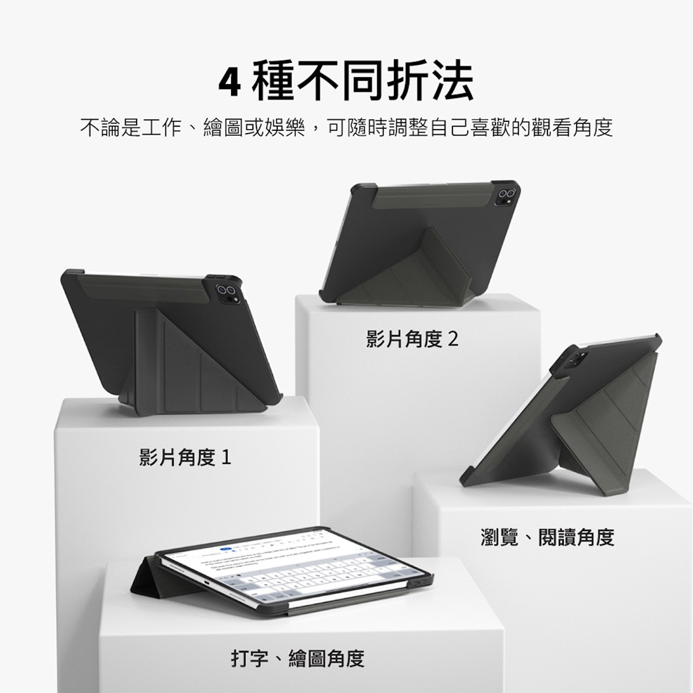 Origami多功能保護殼,內建折疊支架,提供 4 種不同的折疊及支撐方式,可任意變換使用角度,滿足多種情境。翻蓋式自動喚醒功能,滿足 iPad 重度使用者的日常所需。磁吸外扣的置筆設計,方便收納觸控筆的同時也能保持精簡外觀。