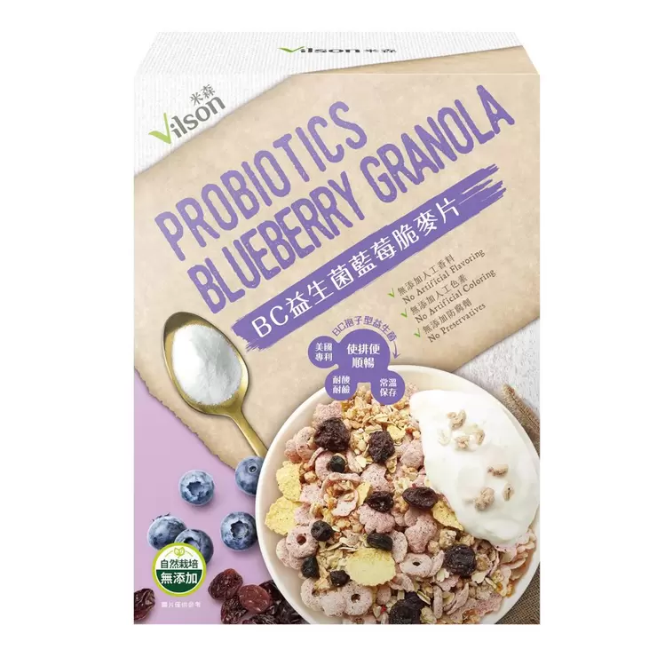 | 成分 | 原味脆麥片、覆盆莓穀脆片、大燕麥片、覆盆莓穀脆餅、藍莓乾、葡萄乾、玉米脆片、冷凍乾燥藍莓粉、 BC30凝結芽孢桿菌 |