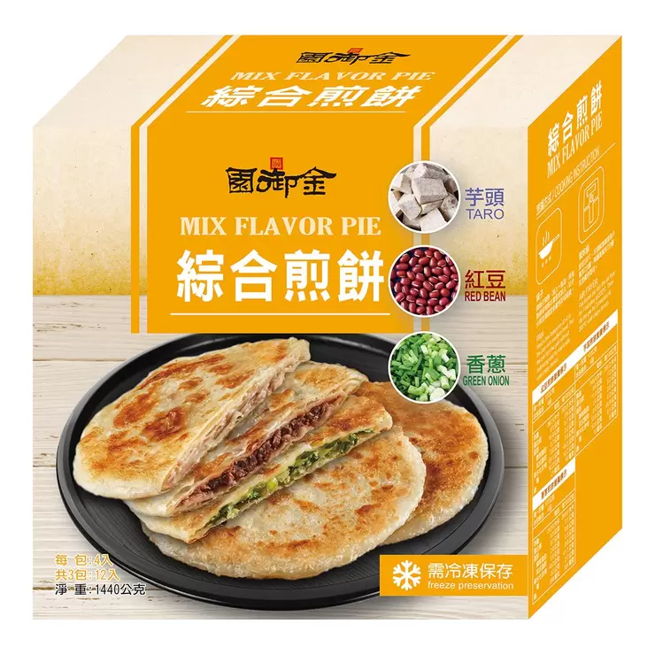 | 成分 | 紅豆煎餅:麵粉、紅豆餡(紅豆、麥芽糖、紅豆沙、特級砂糖、棕櫚油、食鹽)、水、大豆油、棕櫚油、蔗糖、芝麻 芋頭煎餅:麵粉、芋泥餡(白豆沙、芋頭、特級砂糖、麥芽糖、棕櫚油、食鹽)、水、大豆油、棕櫚油、蔗糖 香蔥煎餅:麵粉、水、青蔥、洋蔥、棕櫚油、大豆油、粉絲(馬鈴薯澱粉、豌豆澱粉、綠豆澱粉)、油蔥酥(蔥頭、麥麩酥、玉米澱粉、棕櫚油)、芝麻、蔗糖、食鹽、芝麻香油(大豆油、芝麻油)、醬油(水、蔗糖轉化液糖、非基因改造全粒黃豆、小麥、食鹽、酒精、酵母抽出物)、乾燥蔥、大豆水解蛋白、白胡椒、黑胡椒、香蒜粒【蒜頭、品質改良劑(二氧化矽)】、羥丙基磷酸二澱粉 |