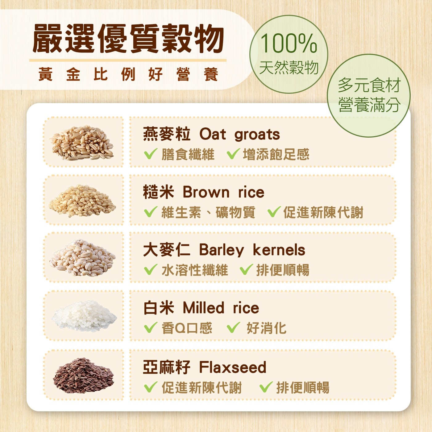 | 成分 | 水、糙米、白米、大麥仁、燕麥粒、亞麻籽 |