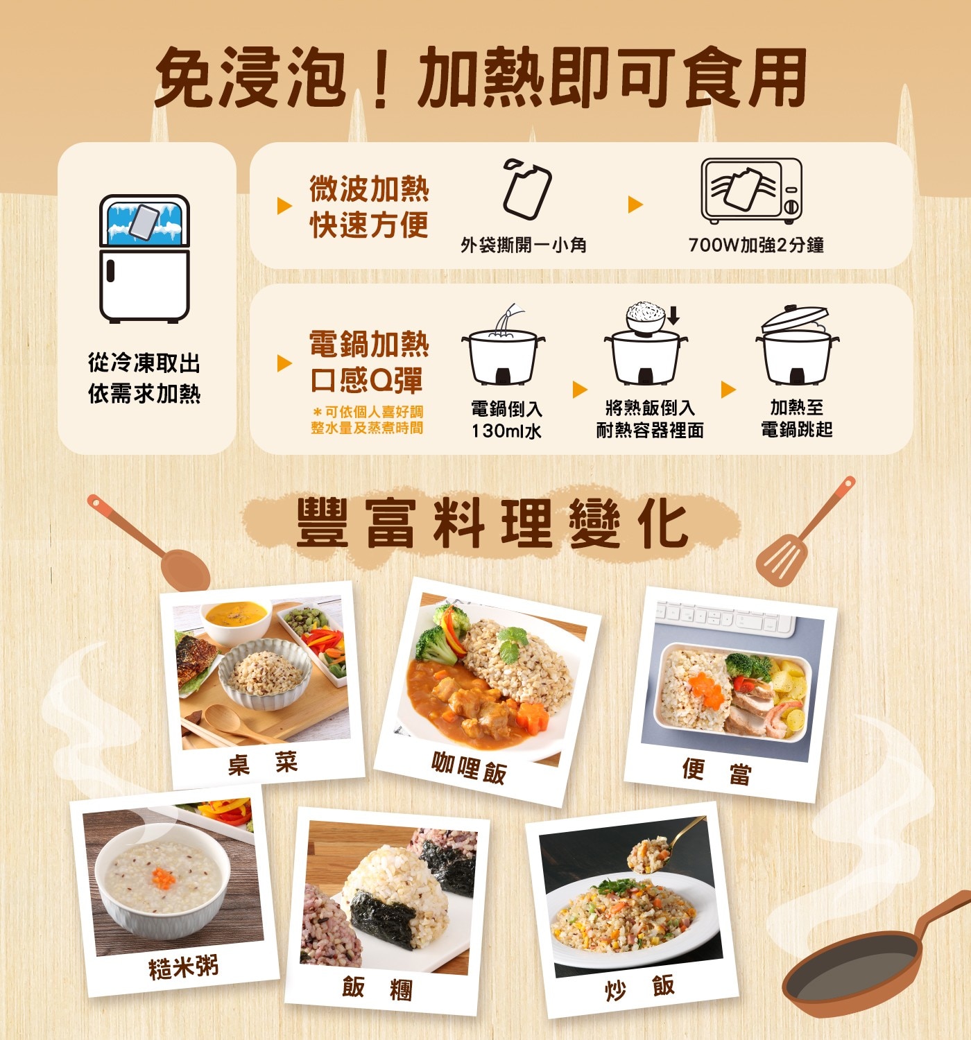 | 使用方式 | 1.微波:毋須解凍,外袋撕開一小角,700W強火加熱2分鐘。 2.電鍋:毋須解凍,外鍋倒入130毫升水,另將商品裝盛於容器上隔水加熱至電鍋跳起即可(約10分鐘) |