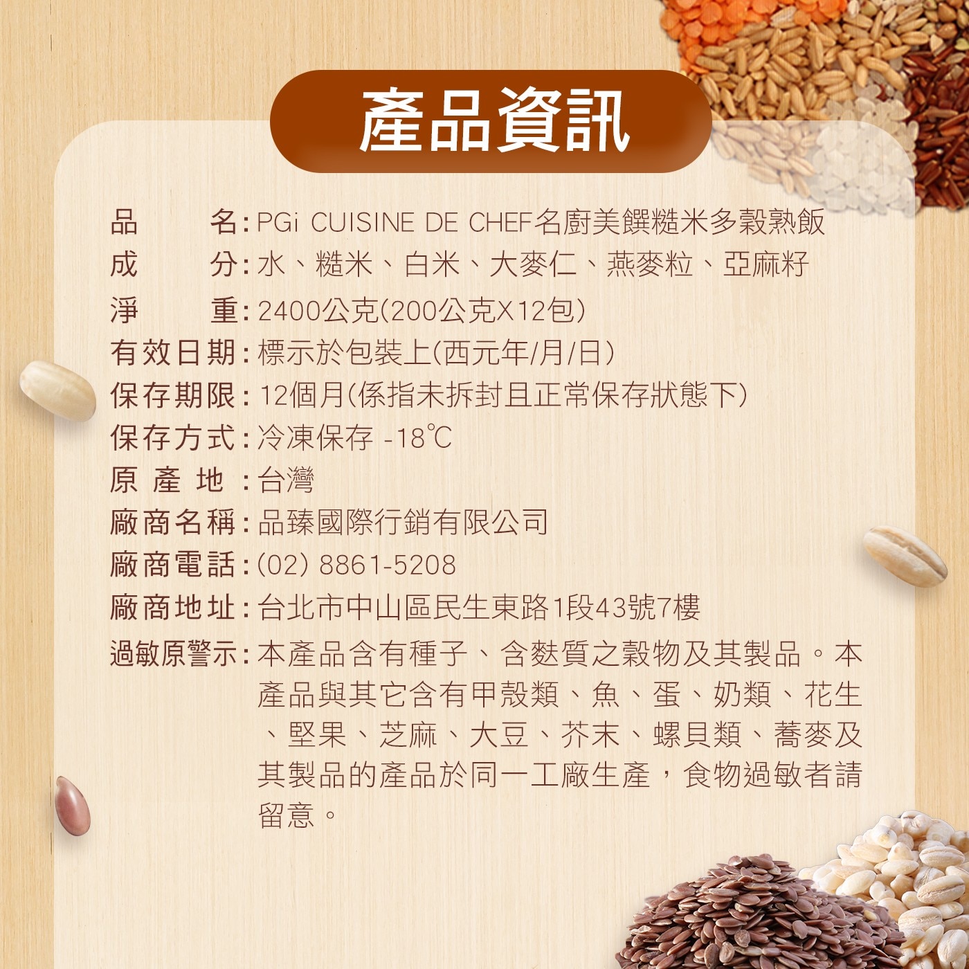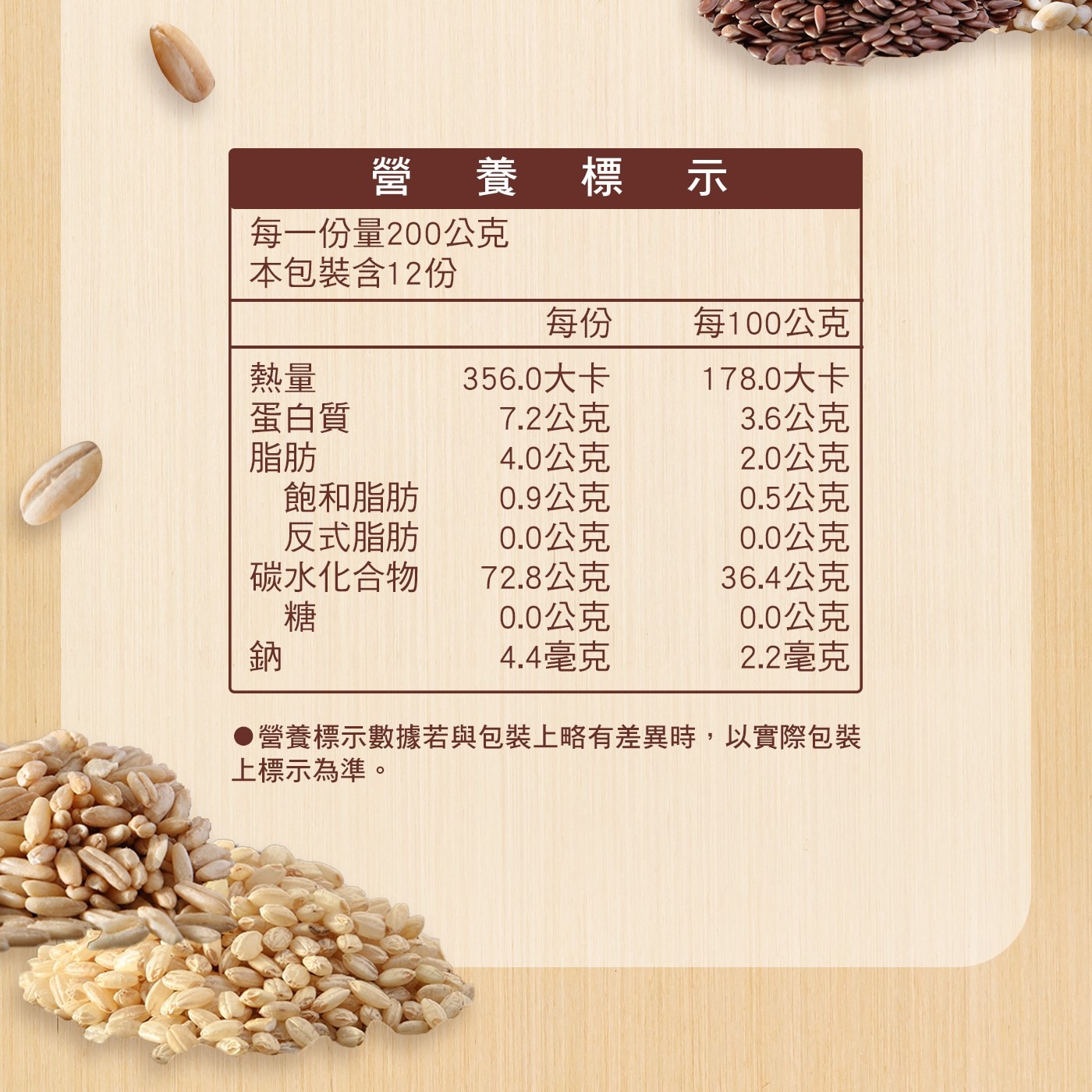 | 過敏原資訊 | 本產品含有種子、含麩質之穀物及其製品。 本產品與其它含有甲殼類、魚、蛋、奶類、花生、堅果、芝麻、大豆、芥末、螺貝類、蕎麥及其製品的產品於同一工廠生產,食物過敏者請留意。 |