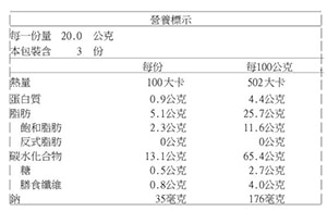 | 保存方式 | 為確保產品品質,產品請存放於陰涼乾燥處。開封後請密封保存並儘快食用完畢。 |