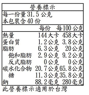 | 過敏原資訊 | 本產品含有麩質穀物,種子類,大豆。本產品工廠同時生產含蛋類,牛奶及堅果類製品,食物過敏者請留意 |