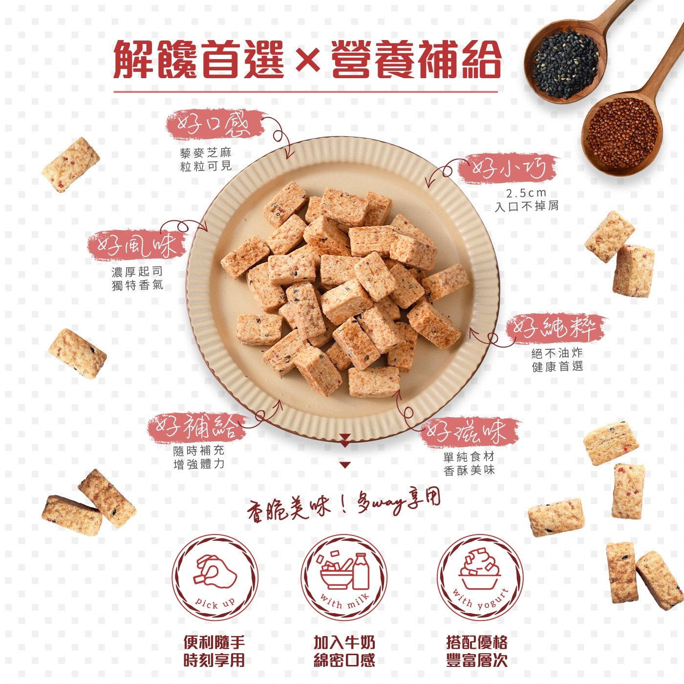 | 成分 | 紅藜麥棒(小麥麵粉、小麥澱粉、椰子油、蔗糖、帕瑪森起司粉(帕瑪森起司(低溫殺菌低脂乳、鹽、乳酸菌、酵素(微生物蛋白酶、真菌凝乳酶))、纖維素粉(樺樹皮)、鹽)、燕麥纖維、紅藜米、鹽、黑芝麻、混合濃縮生育醇(抗氧化劑)) |