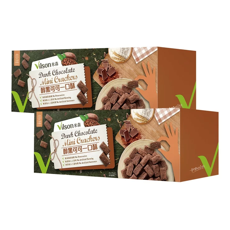 米森 醇黑可可一口酥 20g21包/盒 醇香 不使用 色素 防腐 可可粉 棕櫚油 全素 營養 3食材 每一 都濃郁酥脆 醇香可可粉 香醇濃郁,不膩口 小麥麵粉 口感紮實,越嚼越香 一口接著一口 越吃越涮嘴 DARK CHOCOLATE CRACKERS Vilson 米森 解饞首選營養補給 好口感 濃郁加倍 醇不膩口 好風味 頂級可可 獨特香氣 好小巧 2.5cm