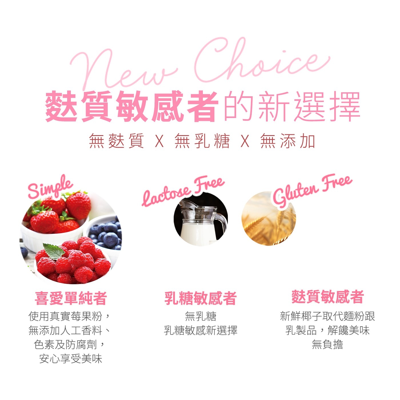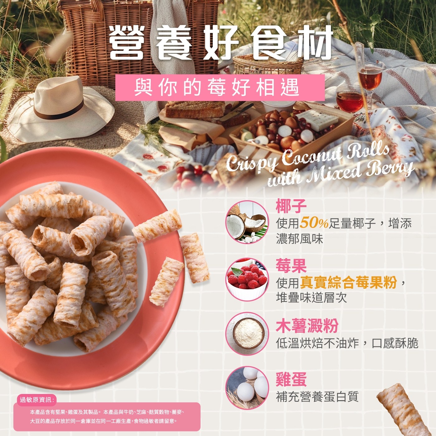 | 成分 | 椰子、木薯澱粉、砂糖、雞蛋、綜合莓果粉(藍莓、覆盆莓、蔓越莓、草莓)、碘鹽 |