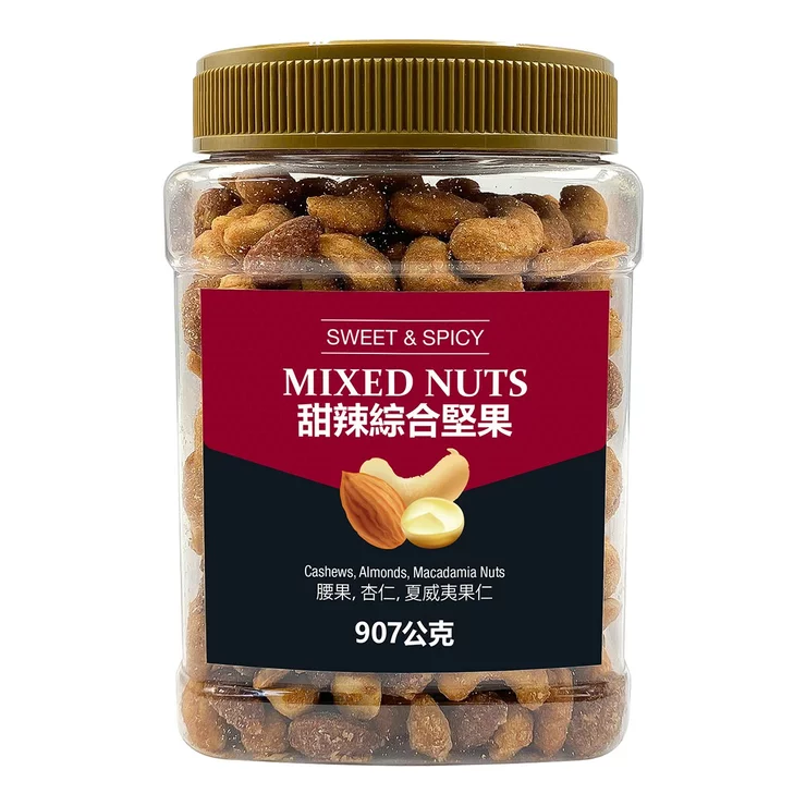 | 成分 | 腰果,杏仁,夏威夷豆,糖,糖粉(糖,玉米澱粉),葵花籽油,海鹽,蜂蜜,辣椒粉,大蒜粉,洋蔥粉 |