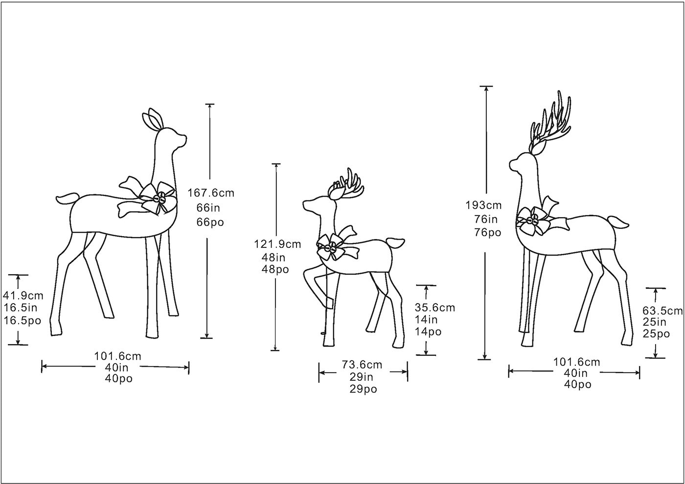商品尺寸 | 公鹿: 長 101.6公分 X 寬 63.5公分 X 高 193公分 母鹿: 長 101.6公分 X 寬 41.9公分 X 高 167.6公分 小鹿: 長 73.6公分 X 寬 35.6公分 X 高 121.9公分 |
