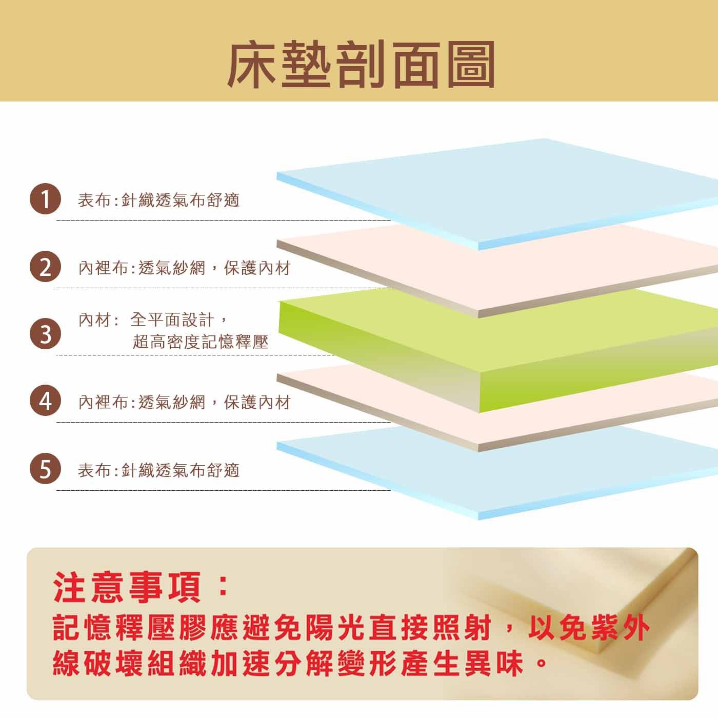 | 材質成分 | " 表布:100%聚酯纖維(針織提花布) 床墊內材:100%聚氨酯(超高密度記憶釋壓棉) " |
