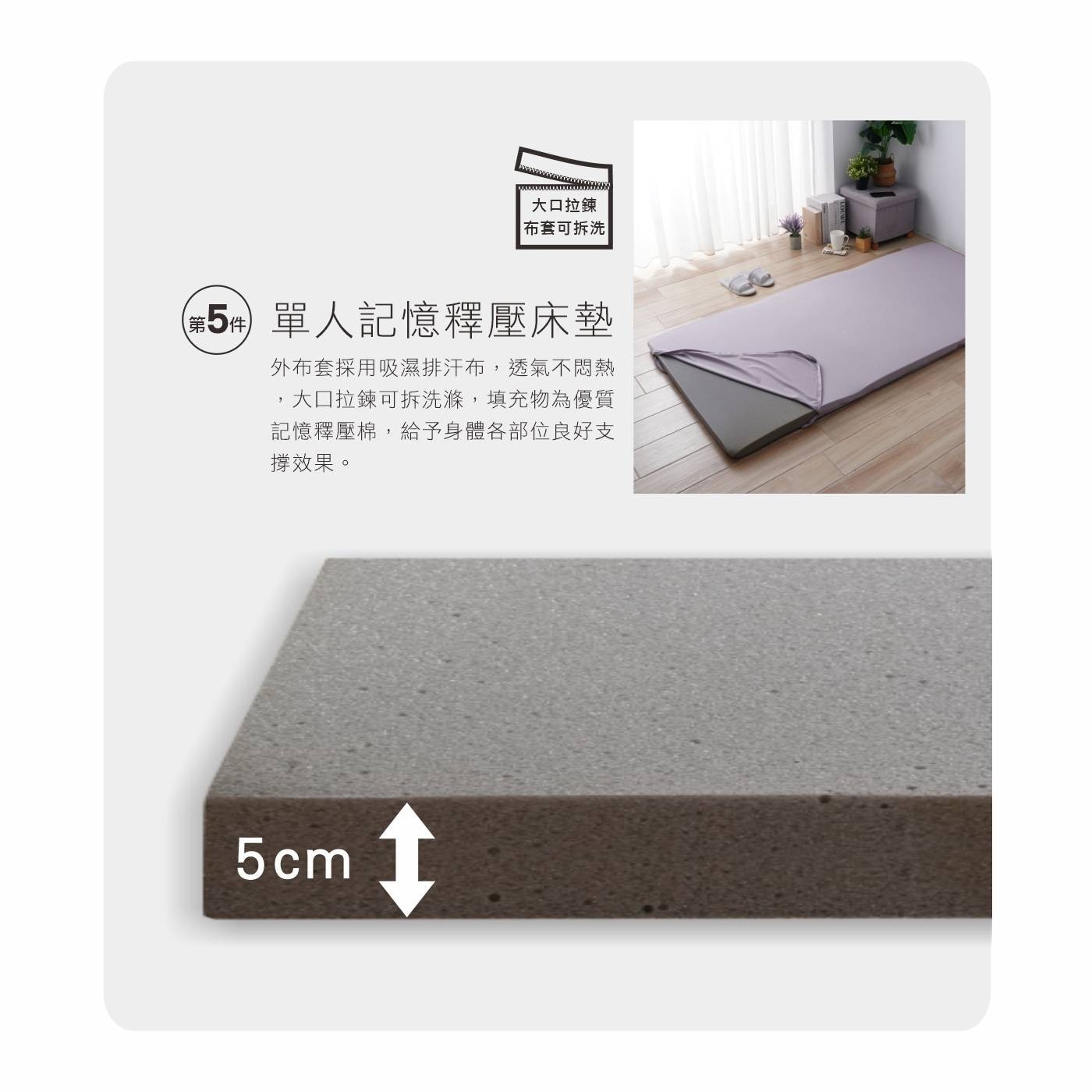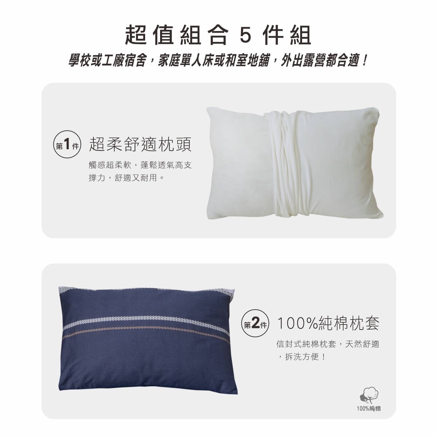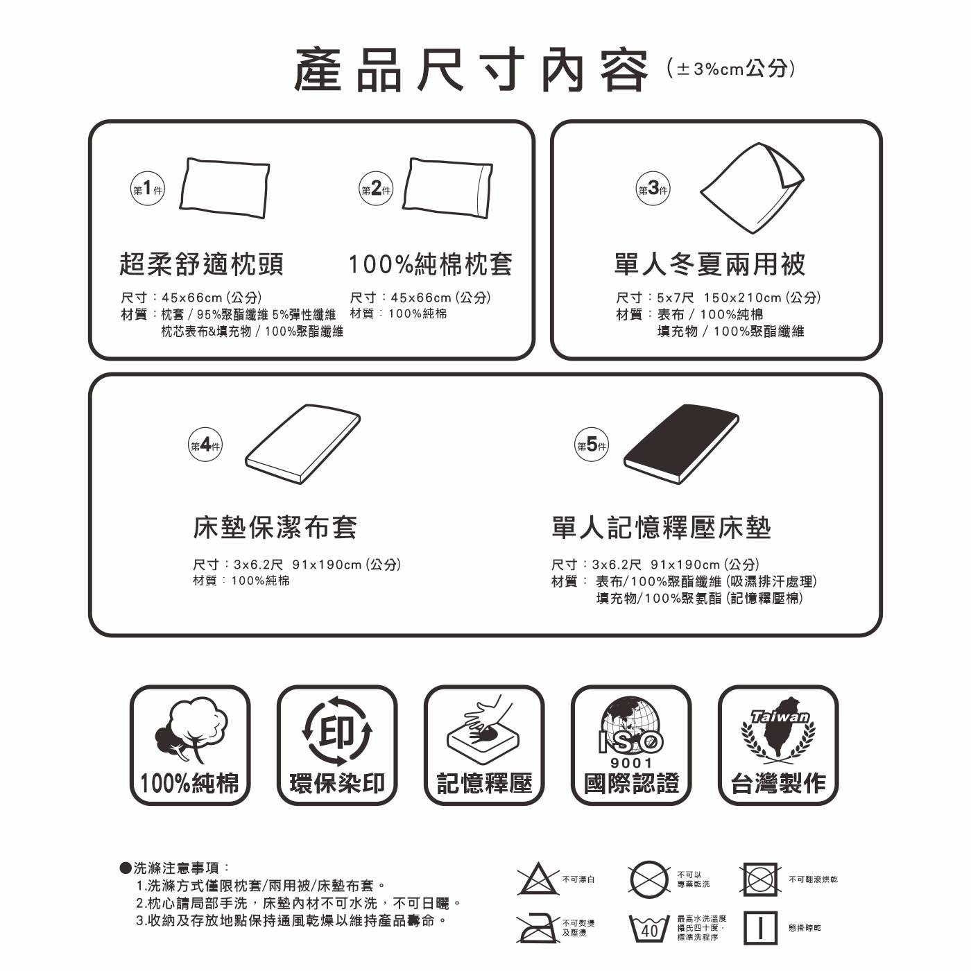 • 產品包含舒適枕、枕頭套、單人兩用被、單人記憶釋壓棉床墊和單人床包