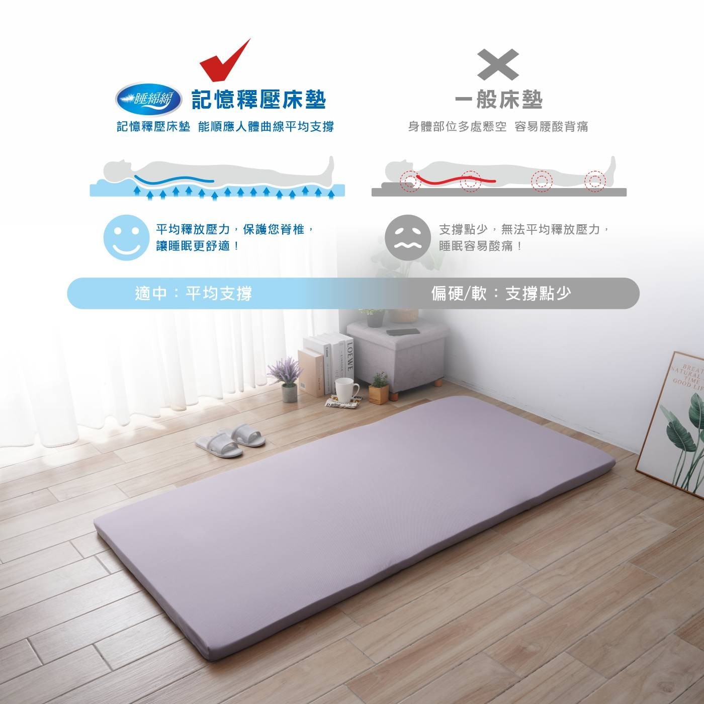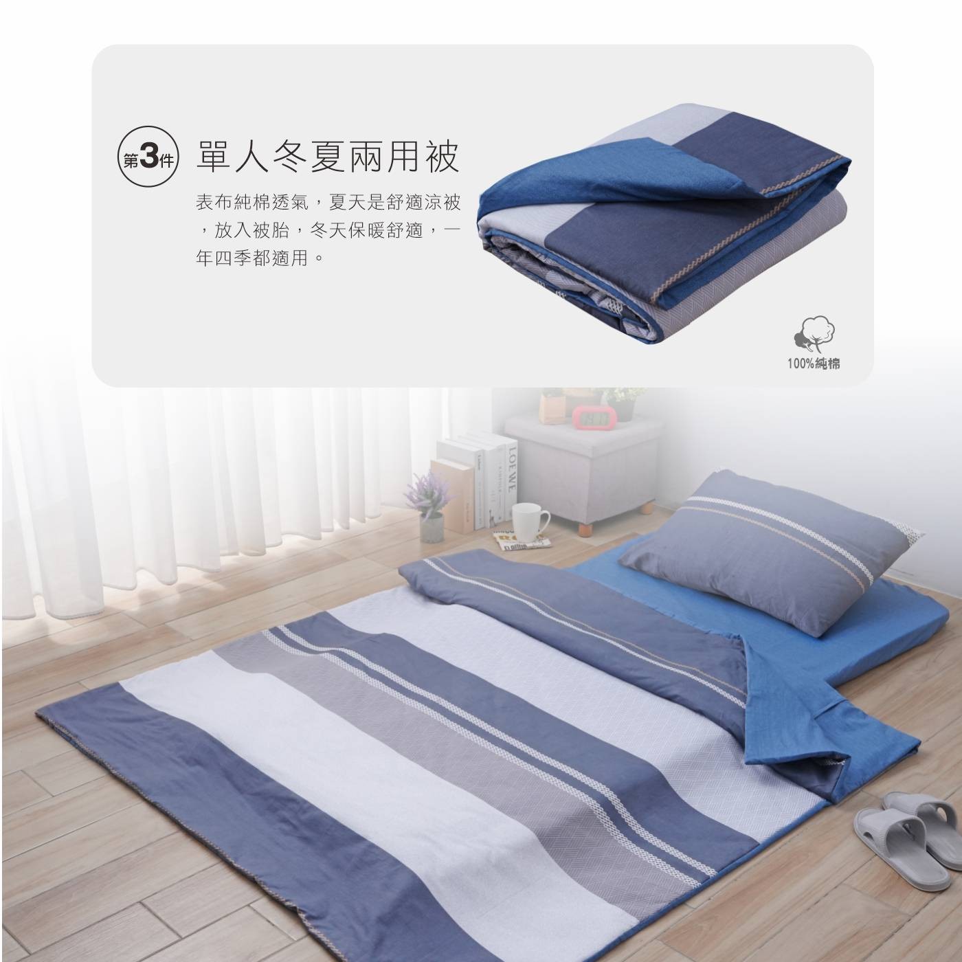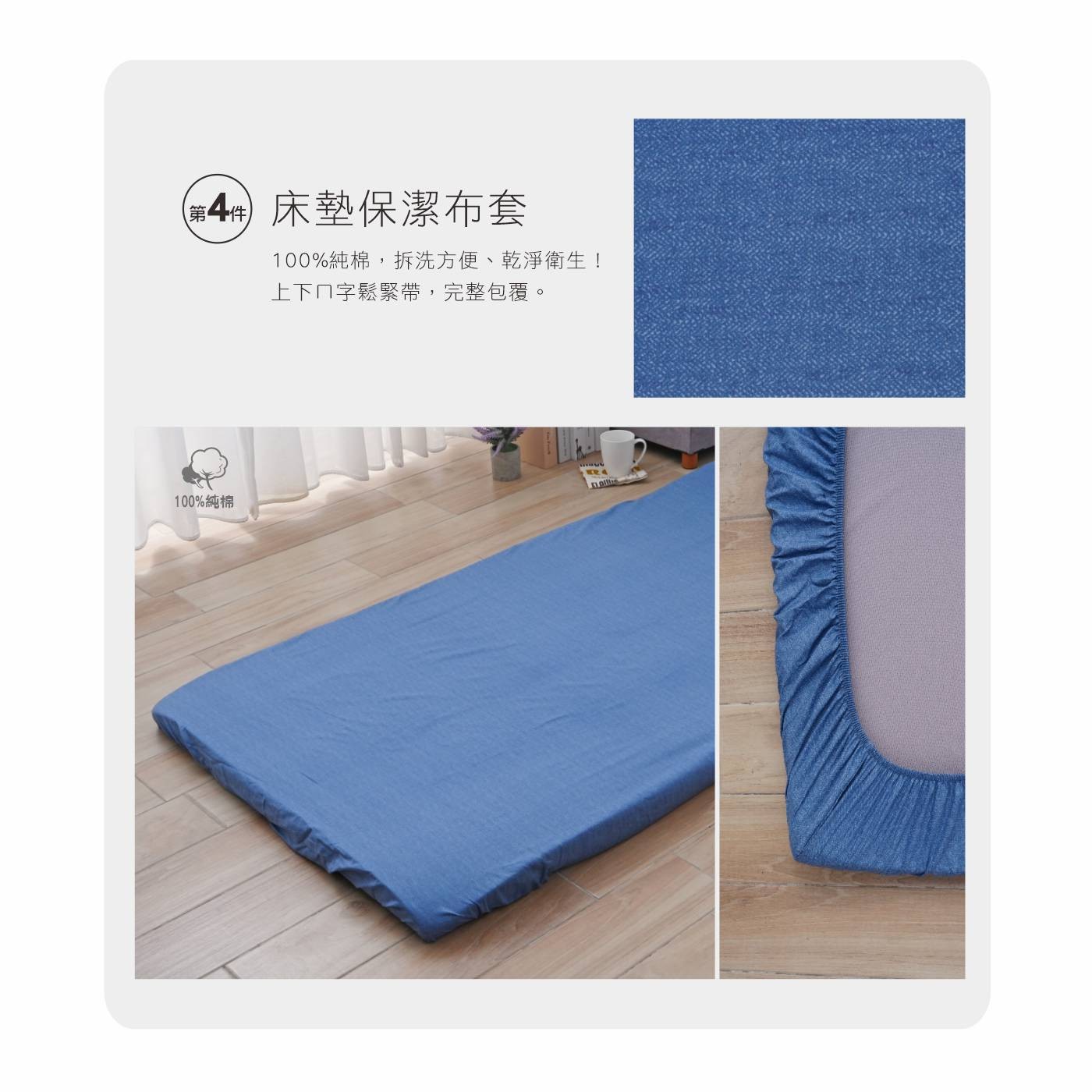 • 產品包含舒適枕、枕頭套、單人兩用被、單人記憶釋壓棉床墊和單人床包