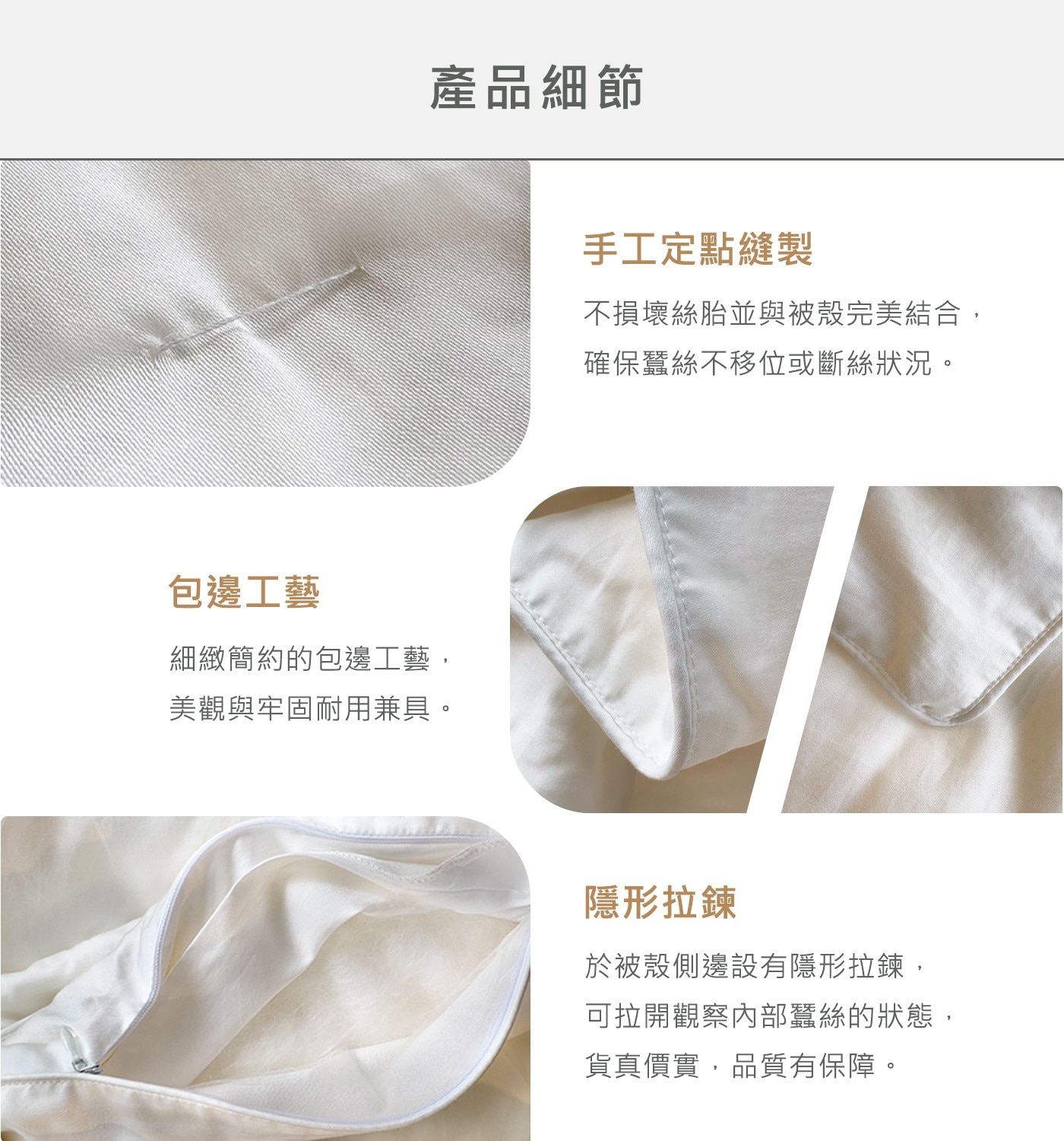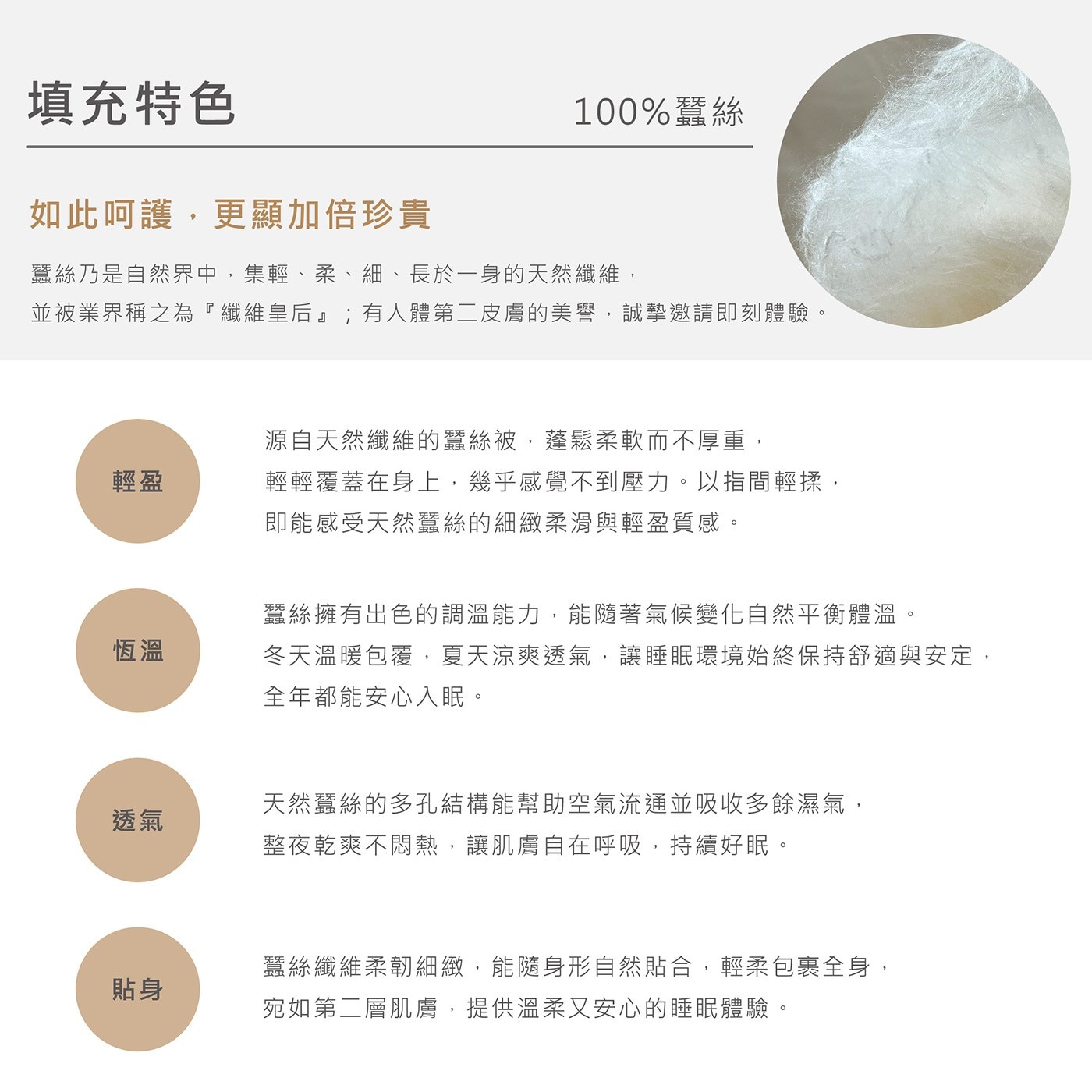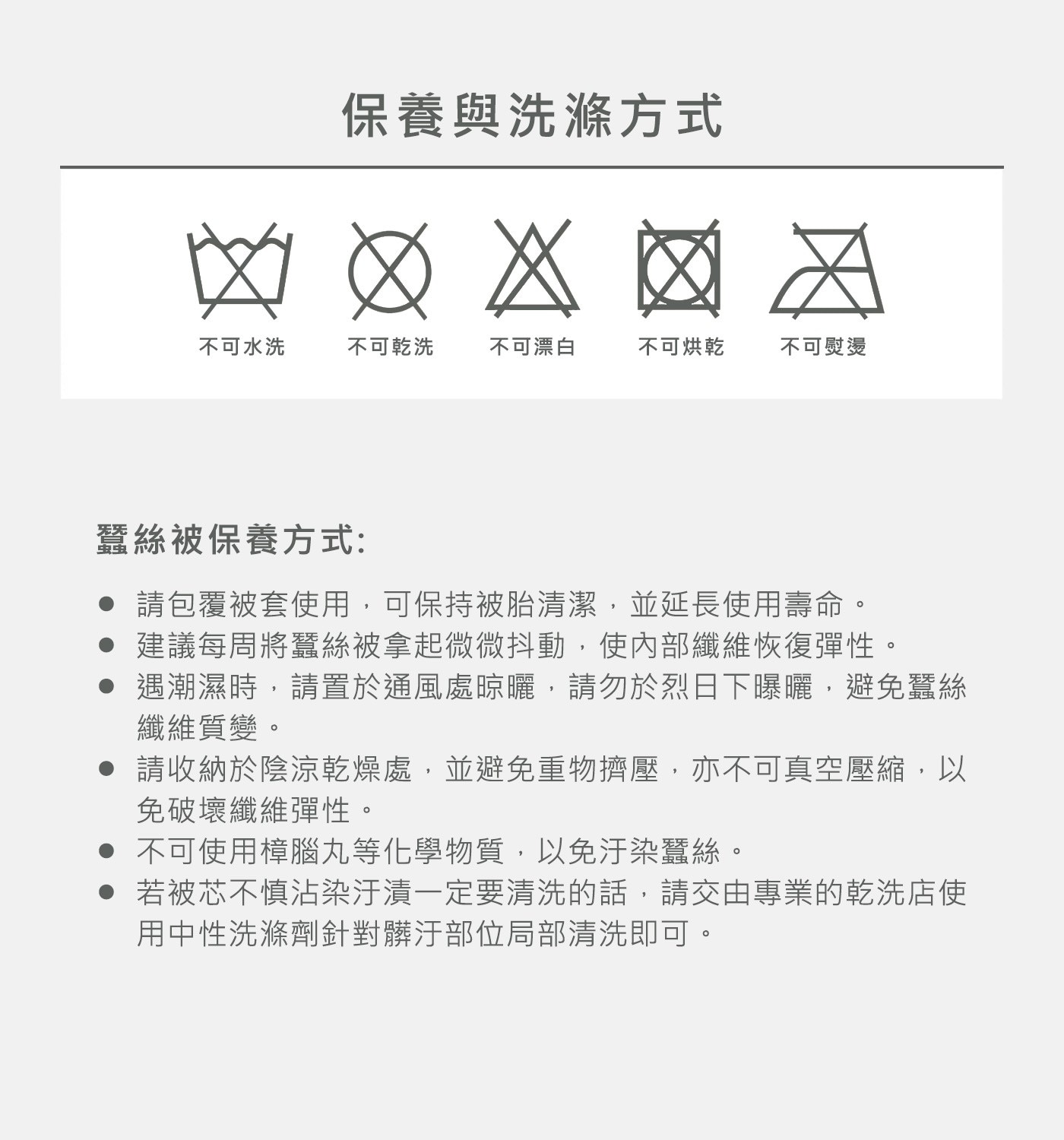 | 保養方式 | 請包覆被套使用,可保持被胎清潔,並延長使用壽命。 建議每週將蠶絲被拿起微微抖動,使內部纖維恢復彈性。 遇潮濕時,請置於通風處晾曬,請勿於烈日下曝曬。 請收納於陰涼乾燥處,避免重壓。 |