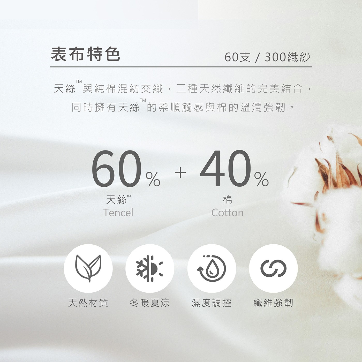| 材質成分 | 表布:60%萊賽爾纖維 40%棉 填充物:100%蠶絲 |