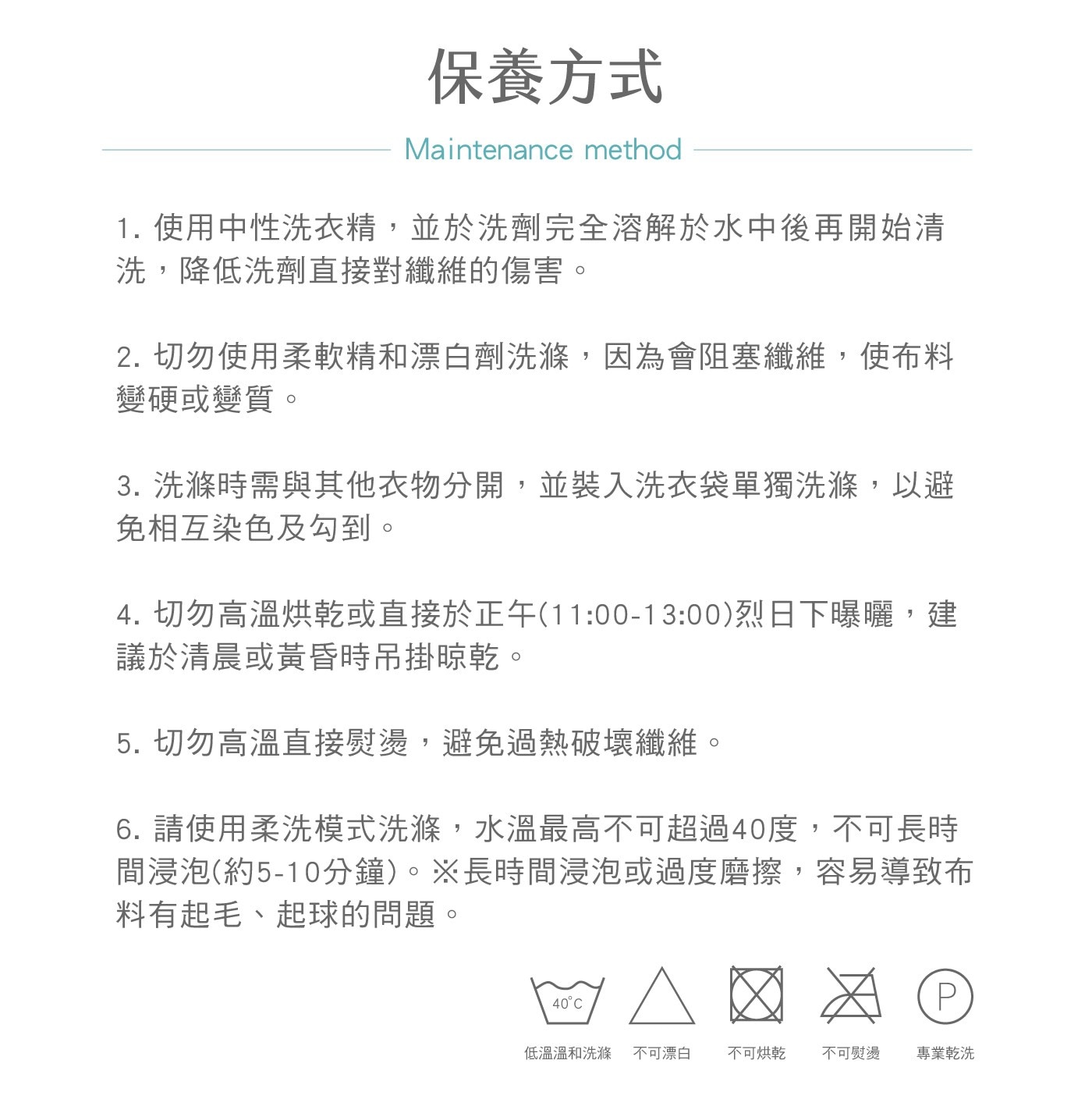 | 洗滌方式 | 可水洗。可乾洗。 不可漂白。不可烘乾。 |
