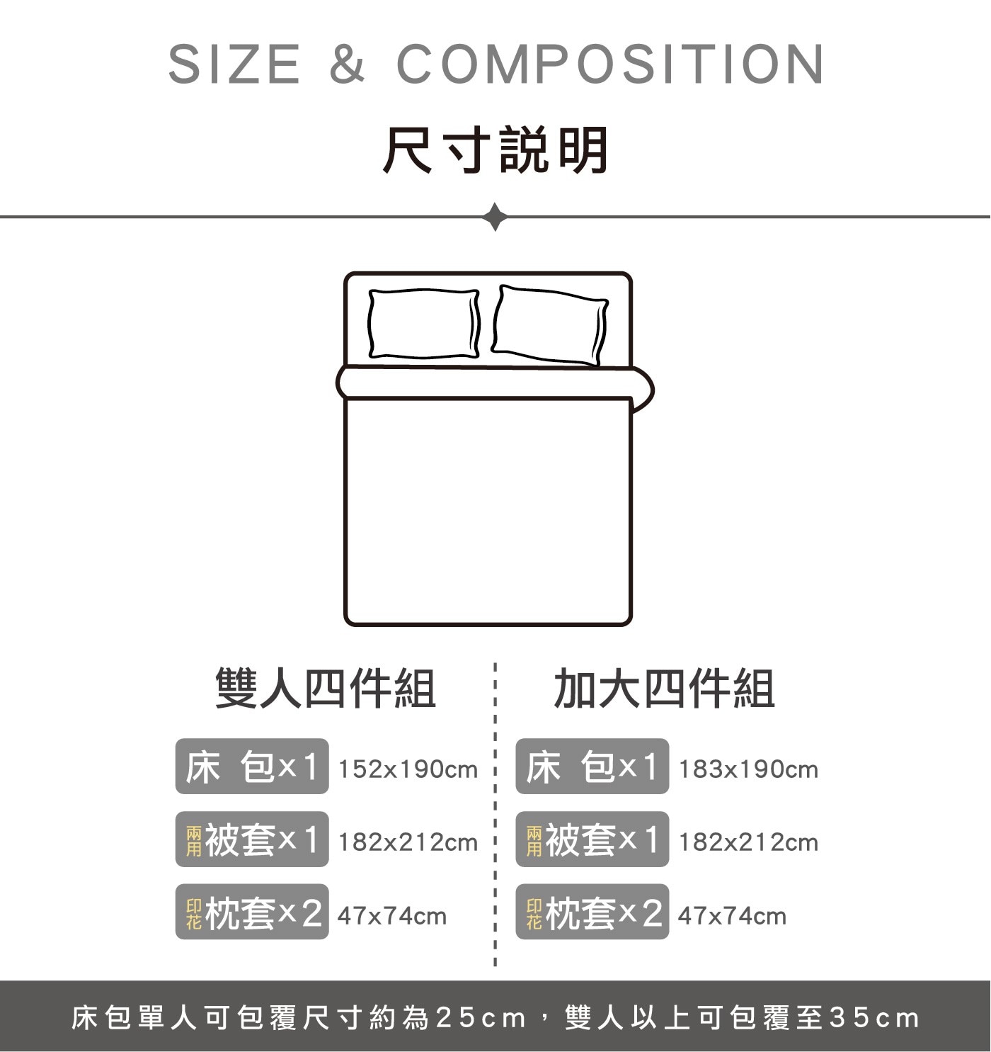 | 內容物 | 素色床包 X 1入 兩用被套 X 1入 單面印花枕套 X 2入 |