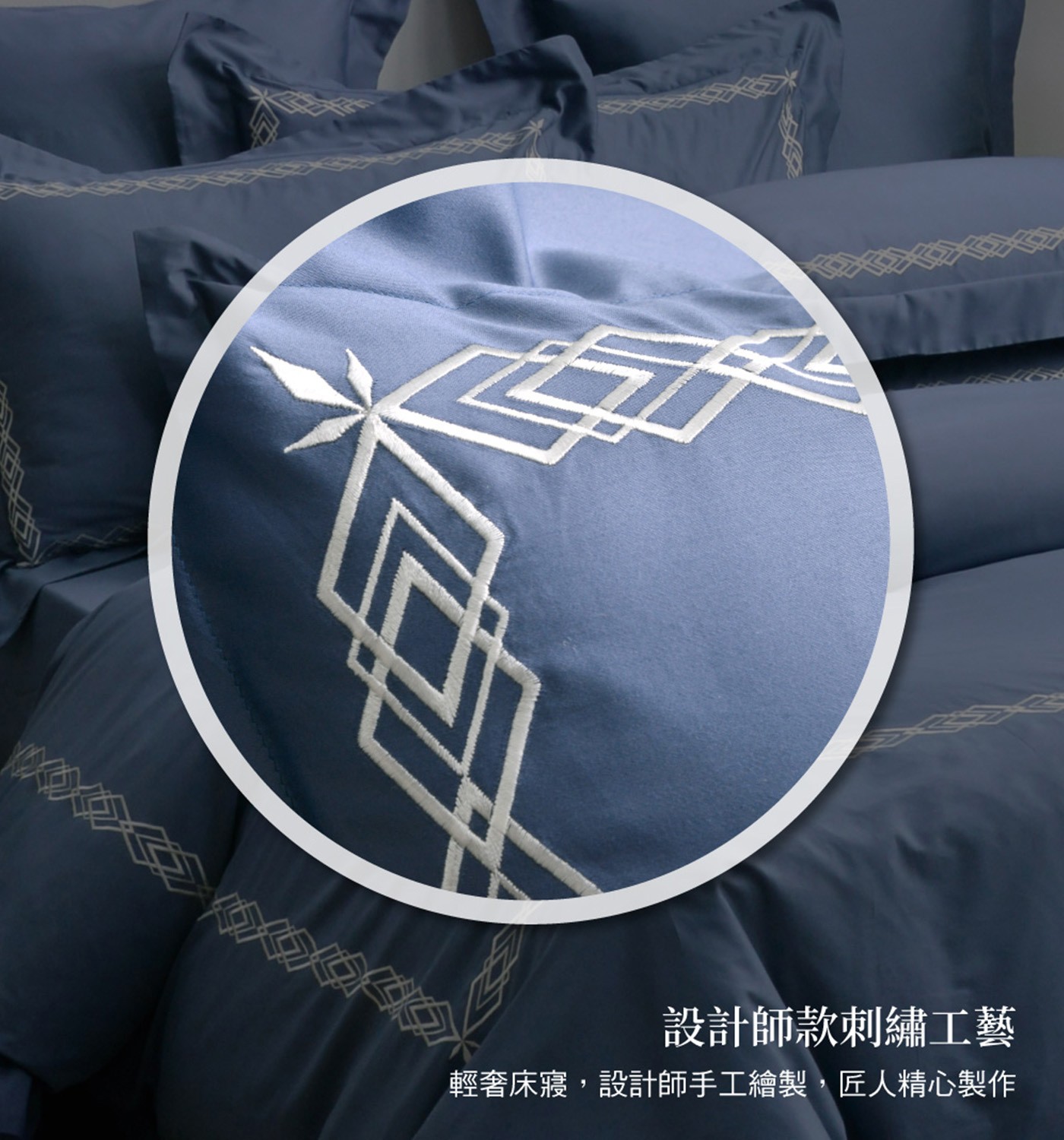 La Belle 雙人特大300織長絨棉刺繡被套床包4件組 180公分 X 210公分 閃耀稜光 午夜藍