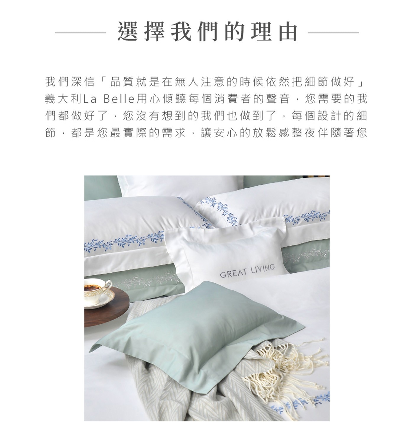 | 內容物 | 床包 X 1 被套 X 1 歐式壓框枕套 X 2 附原廠收納袋 |