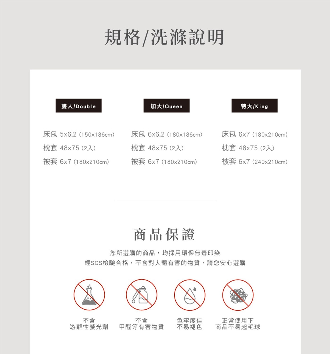 | 商品尺寸 | 被套:240公分 X 210公分 枕頭套:48公分 X 75公分 床包:180公分 X 210公分(床包高度可包覆35公分) |