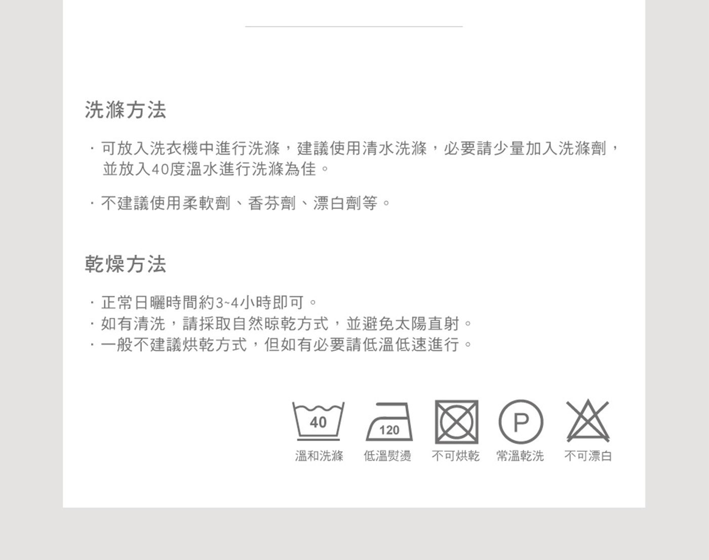 | 洗滌方式 | 可水洗、可乾洗、不可漂白、不可烘乾 |