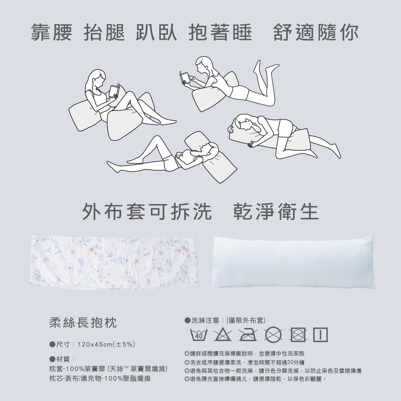 | 材質成分 | 枕套表布:100%萊賽爾 枕心表布:100%聚酯纖維 填充物:100%聚酯纖維 |