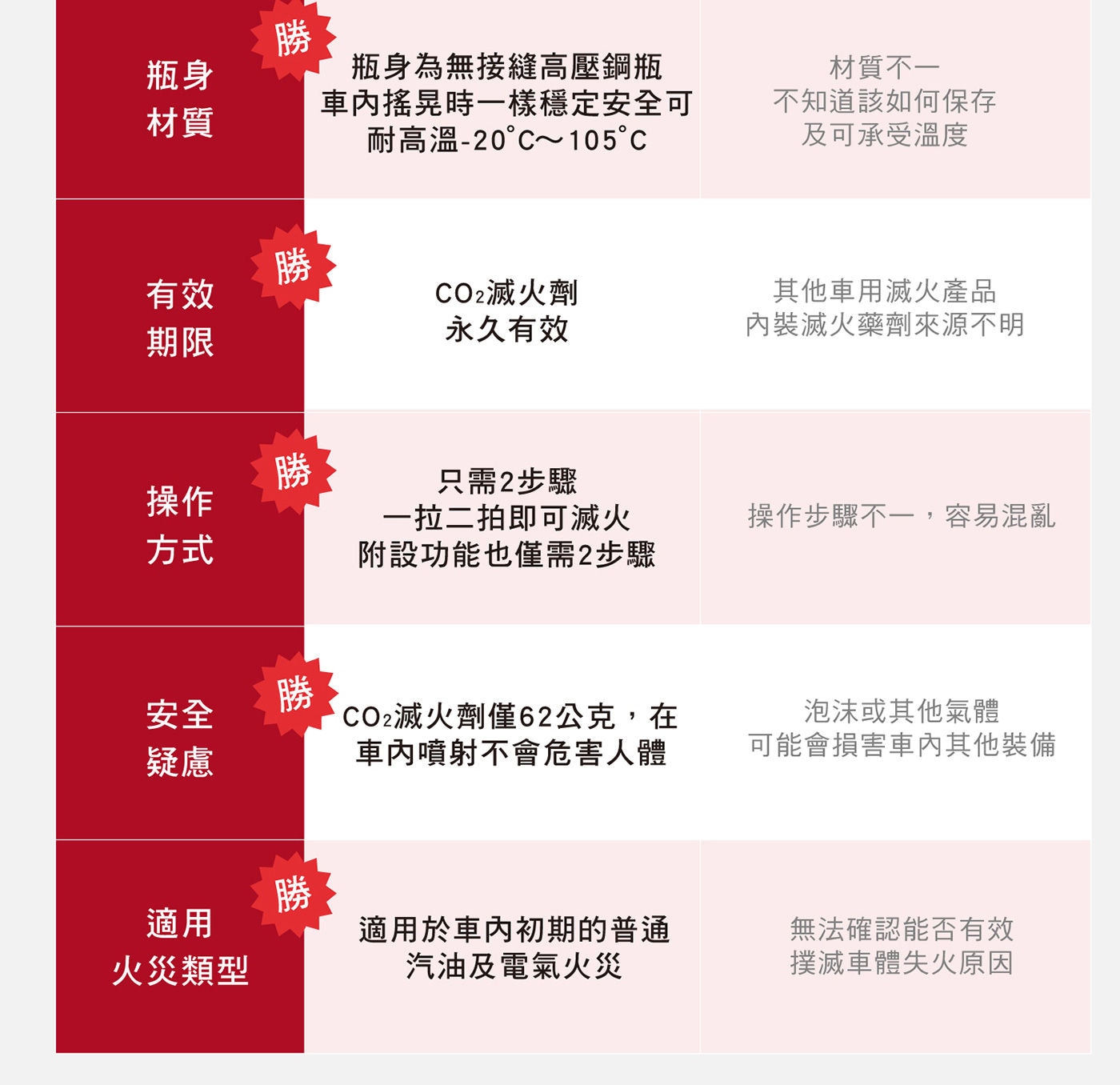| 注意事項 | 操作時注意事項: 1.安裝位置於門旁置物袋、後車廂、收納廂等處。 2.噴灑時使用過後,不可二次使用。 3.請定期檢查產品是否損傷、鏽蝕、裂痕、重量及封籤完整。 警告: 此商品為車輛專用。 初期火災滅火專用商品, 不適用於已擴大的火災。 請勿使用於油炸鍋及石油暖爐引起之火災。 請勿放置水、火中及陽光曝曬處,避免碰撞、摔落。 請放置於孩童無法取得之位置。 底部敲打玻璃之尖端處,請勿朝向他人臉、身體。 |