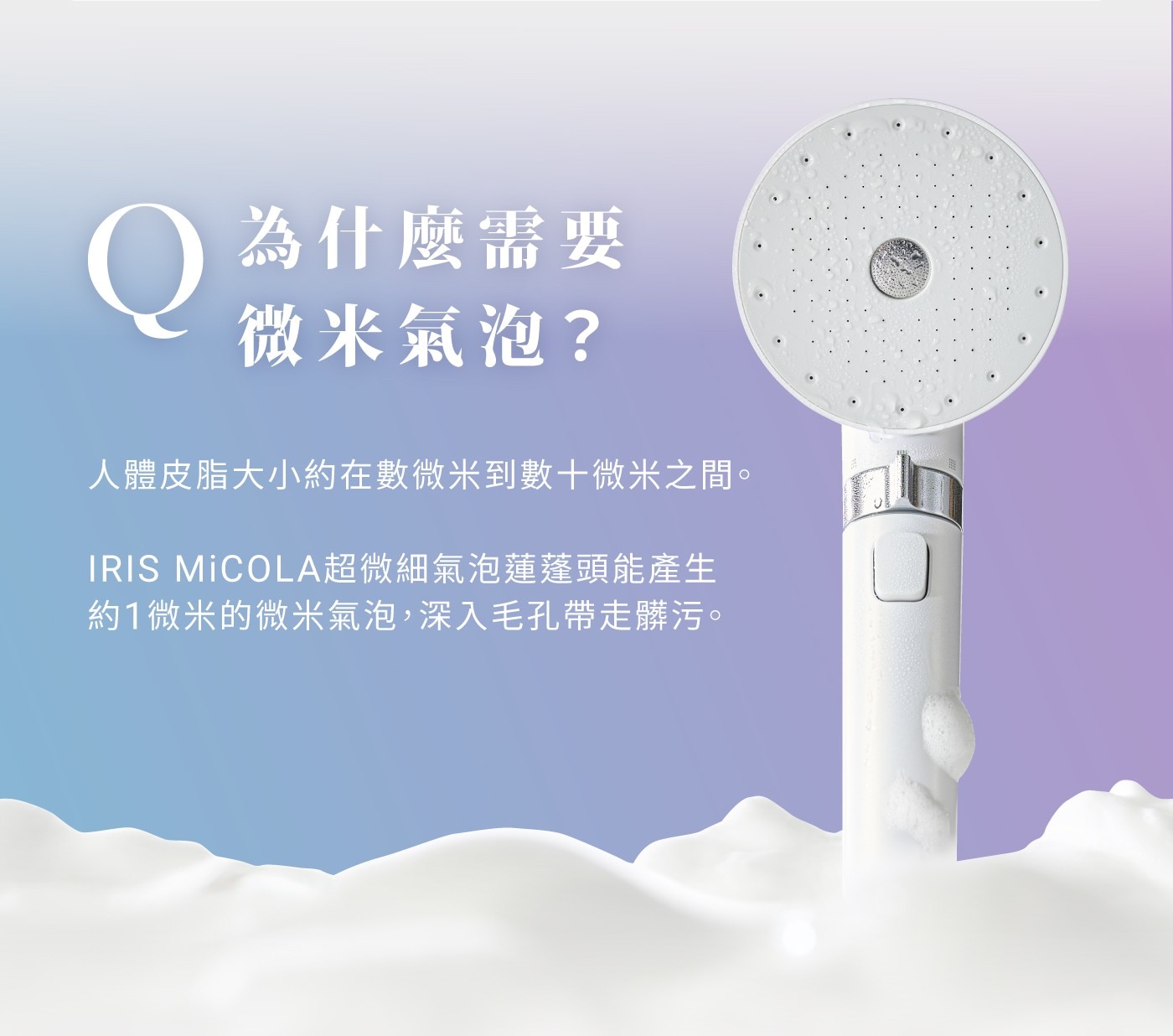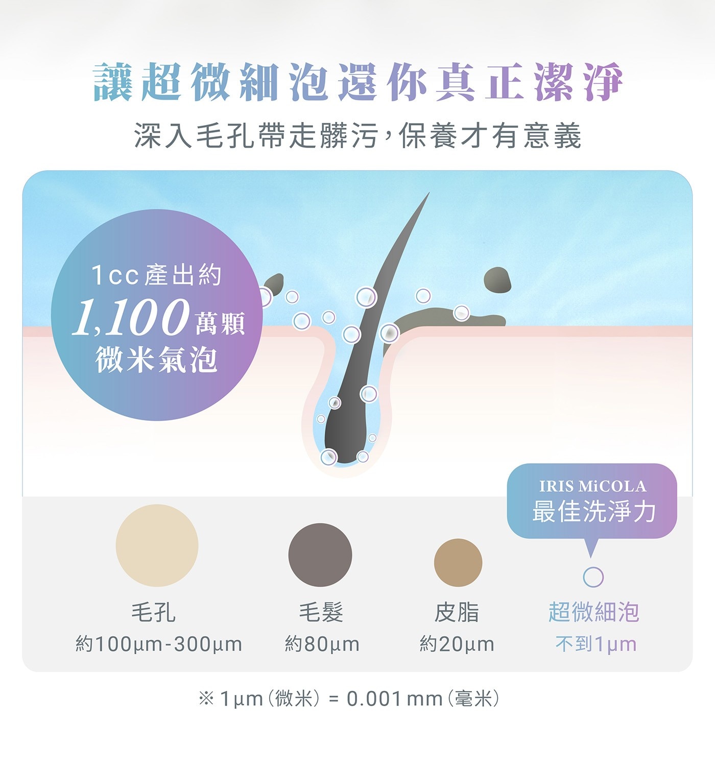 超微細氣泡能深入毛孔深處,吸附污垢並輕鬆帶走。