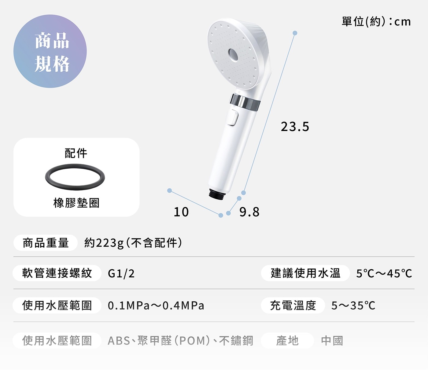 | 內容物 | 蓮蓬頭 X 1、接頭 X 3、外裝環 X 1、墊圈 X 1 |