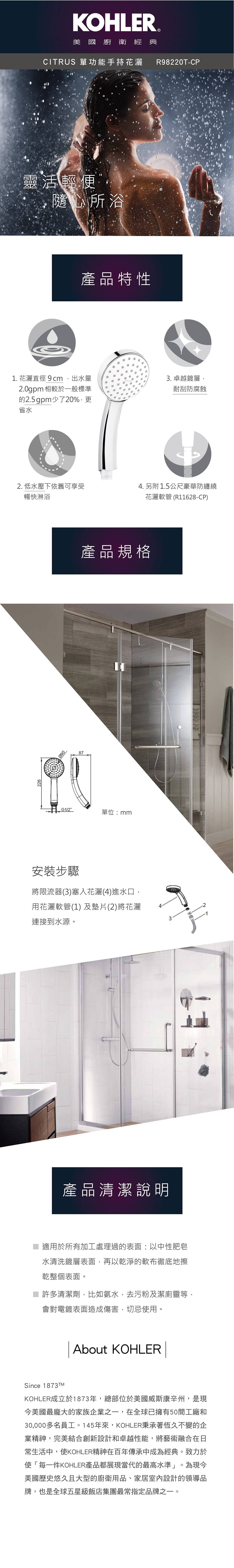 KOHLER 花灑蓮蓬頭附軟管,卓越鍍層,耐刮防腐蝕,低水壓下一就可享受暢快淋浴,另附1.5公尺豪華防纏繞花灑軟管。