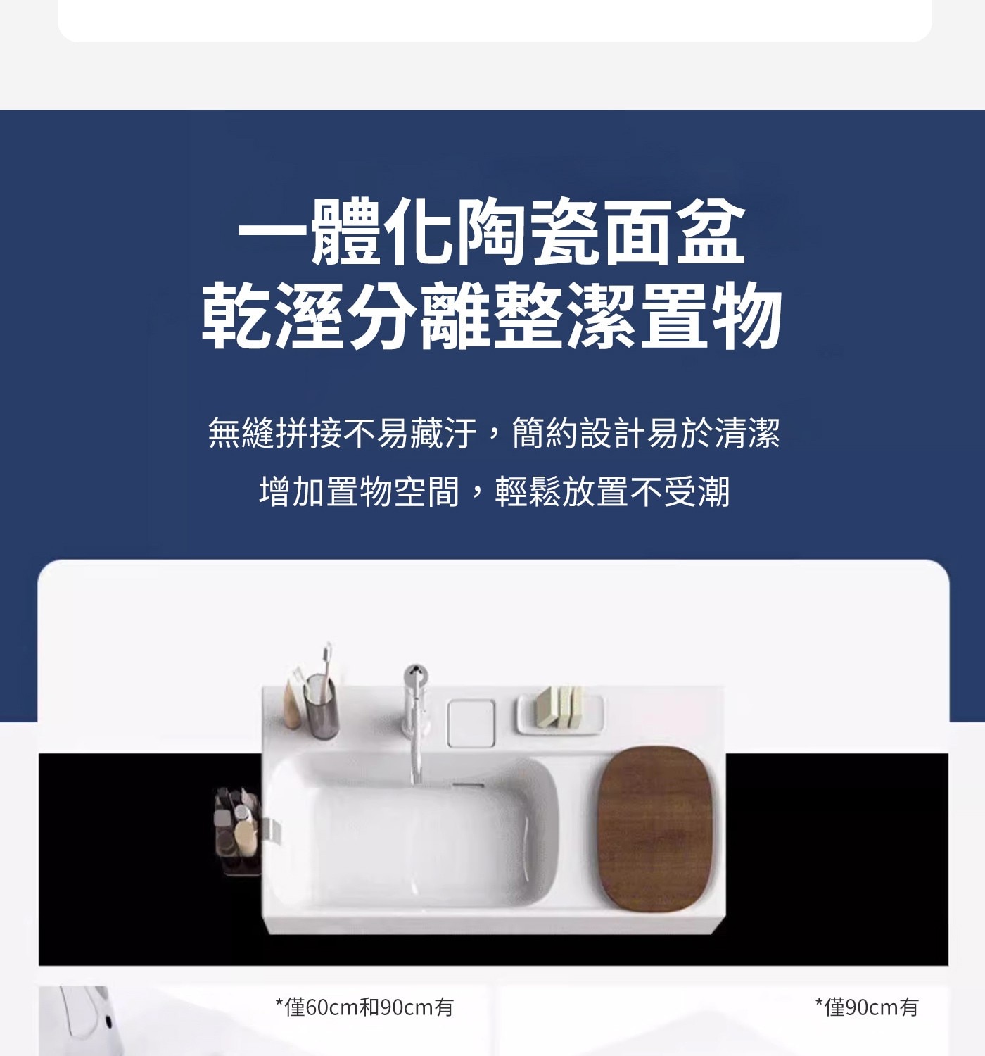 | 注意事項 | 1. 此商品不包含龍頭及其他配件。 2. 浴櫃經過防潮處理,良好的防潮性能可以保證在高相對濕度時仍有良好使用性。但浴櫃無防水功能,使用時不可隨意讓浴櫃被水淋濺, 並請維持浴室乾溼分離,遇有水跡請即時擦乾。 3. 開門請慢慢開啟,避免櫃體門板撞到牆壁。 4. 櫃門關閉時請輕關,讓櫃門自動緩關,切勿用力壓關,避免緩降阻尼故障。 5. 請勿重壓或雙手支撐面盆,以免發生危險。 6. 切勿使用硬物撞擊、摩擦,可能會造成面盆破裂。 |