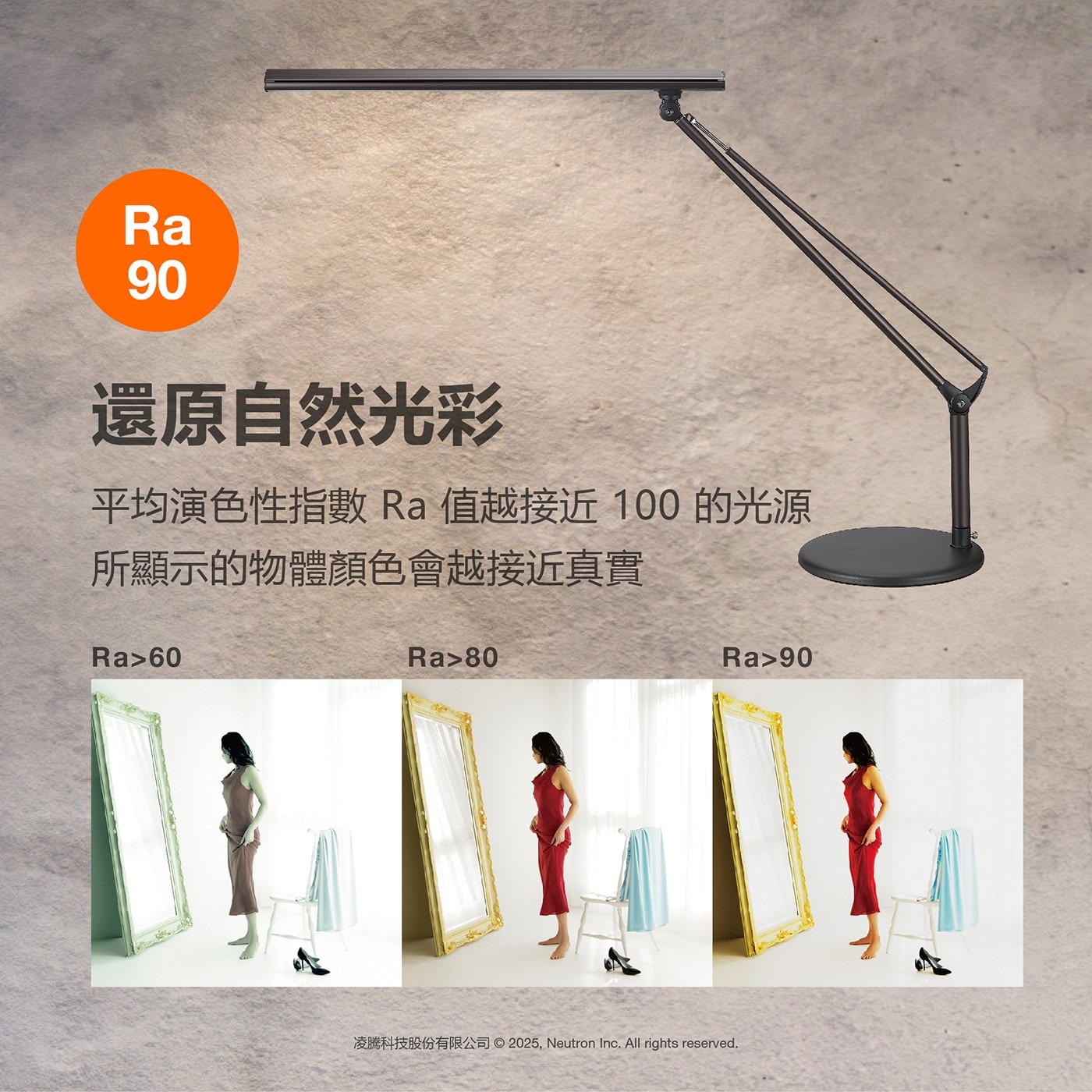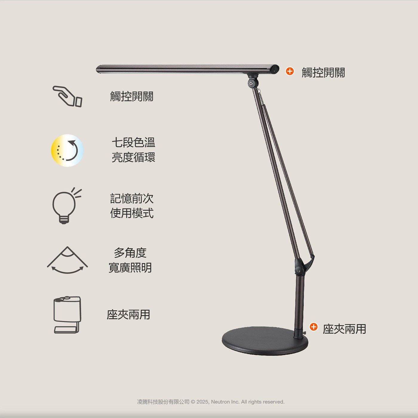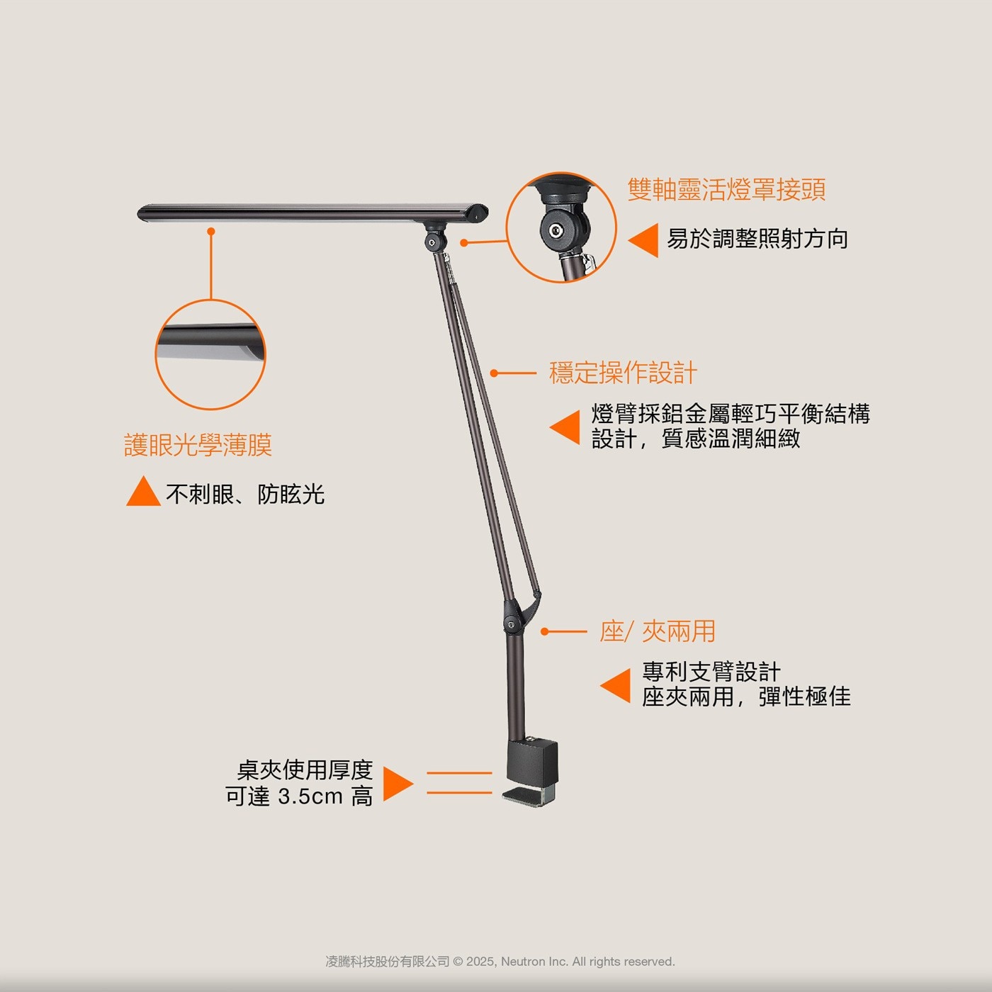 - 燈臂採鋁金屬輕巧平衡結構設計,質感溫潤細緻