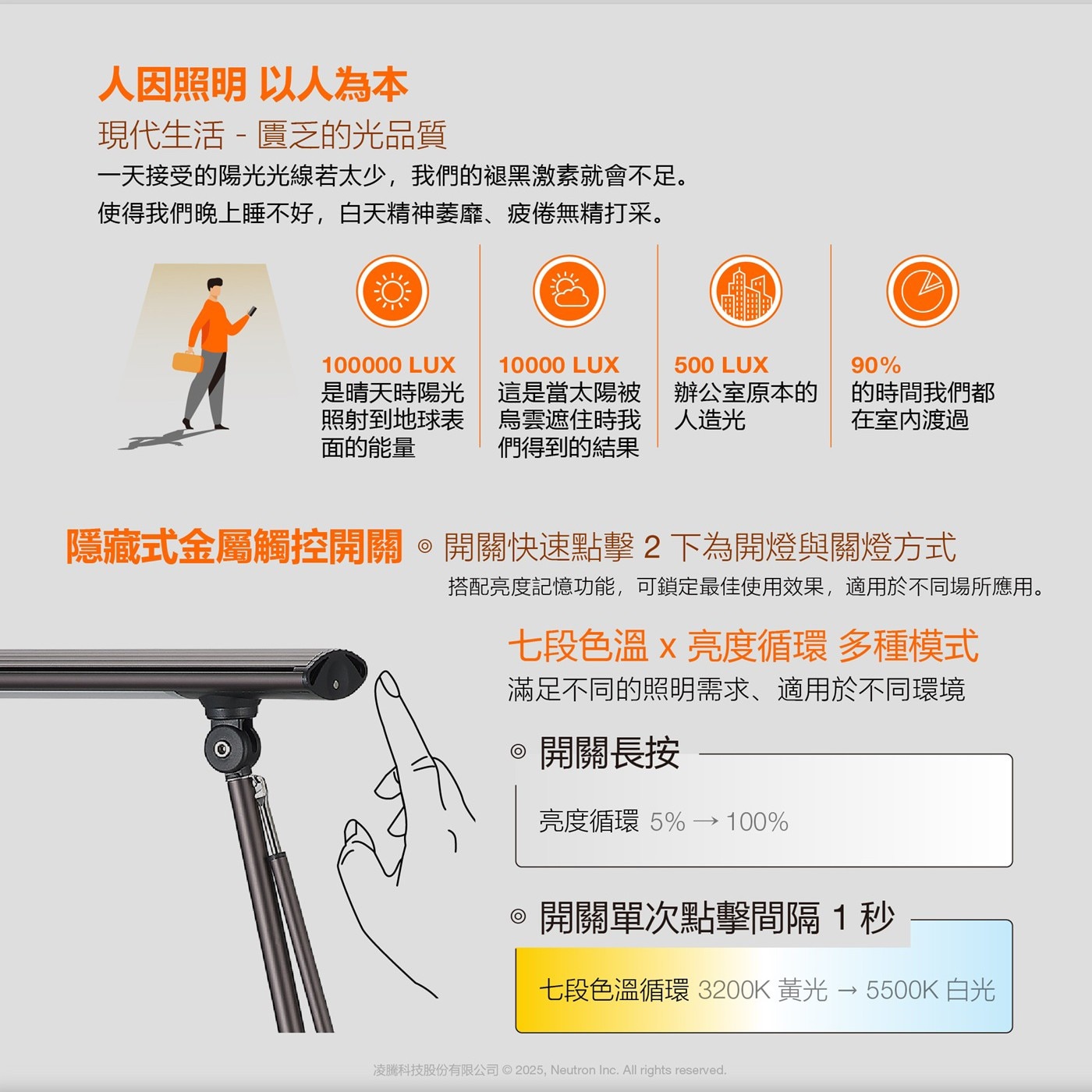 - 觸控式,連續調光,7段調色,3200K黃光到5500K白光