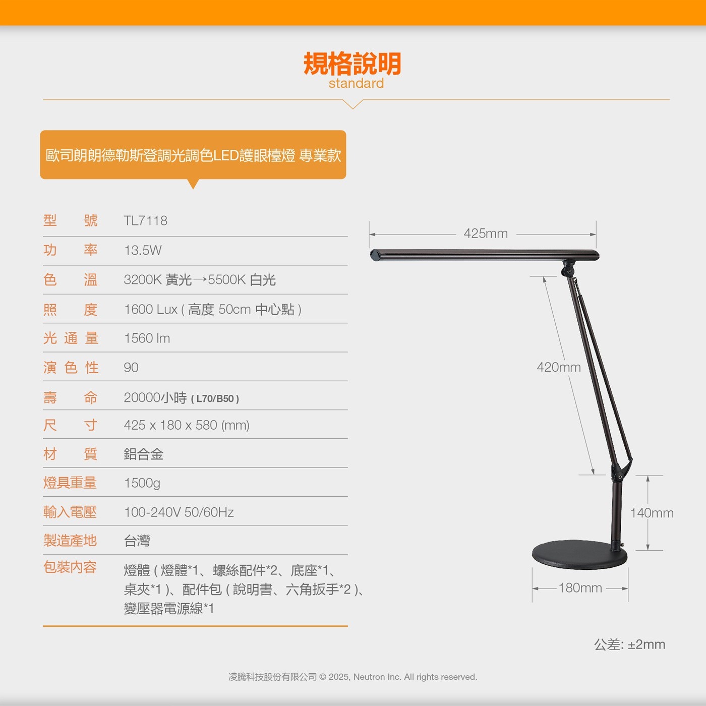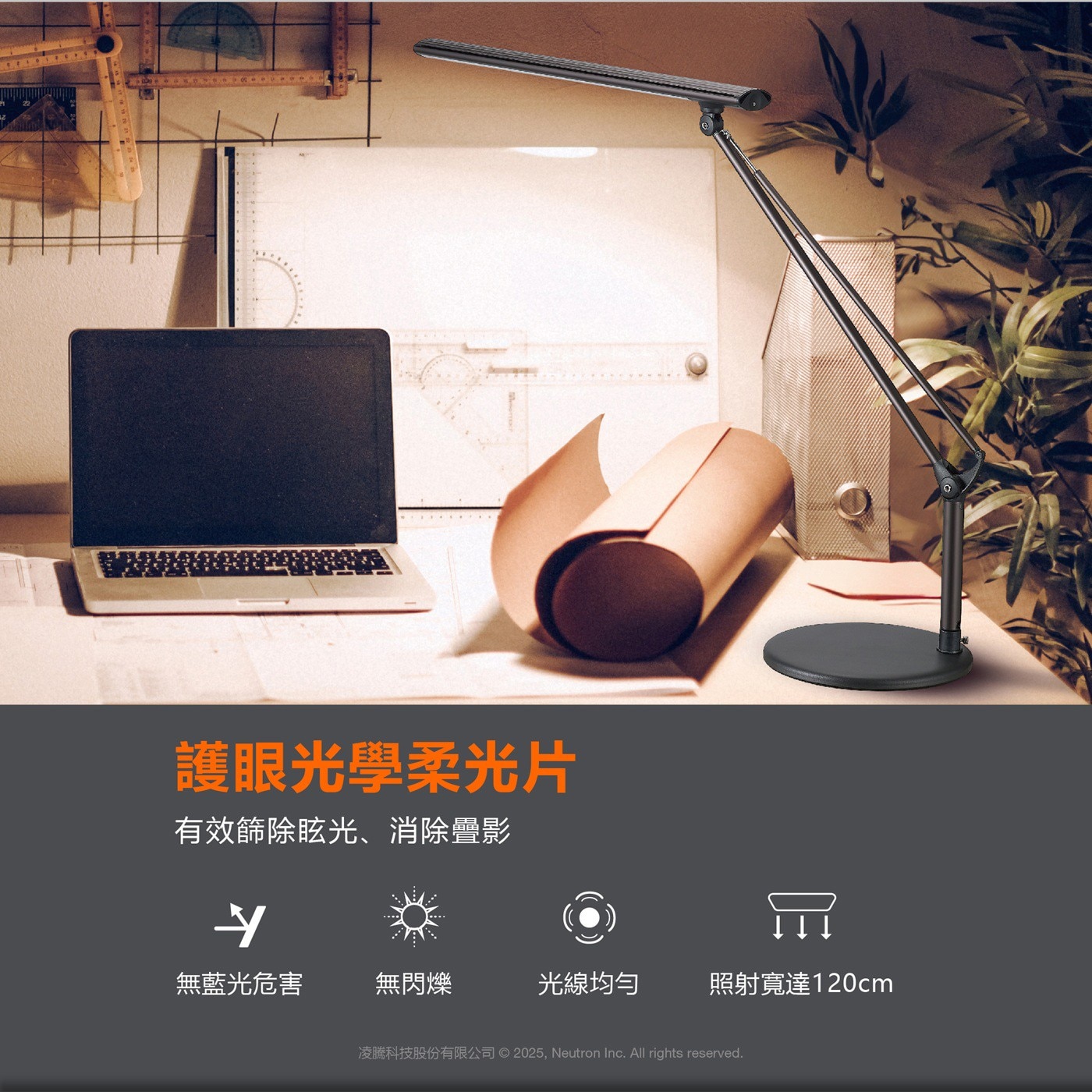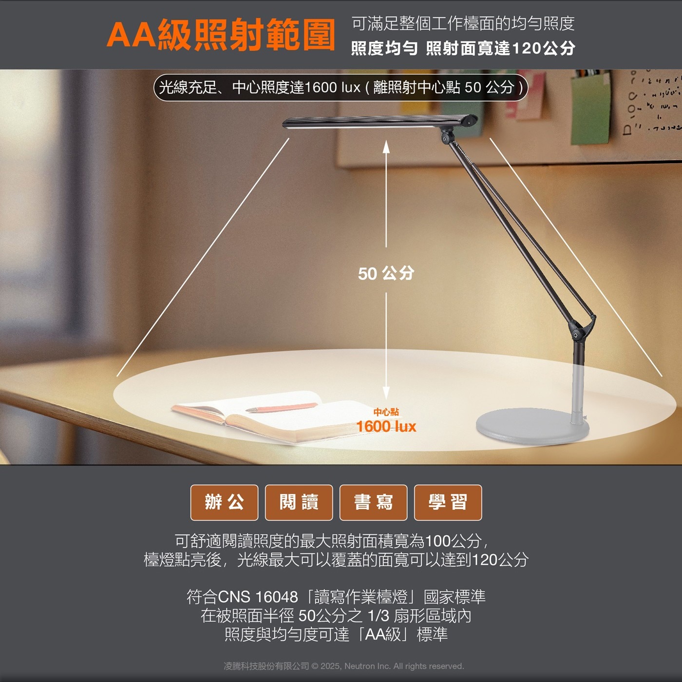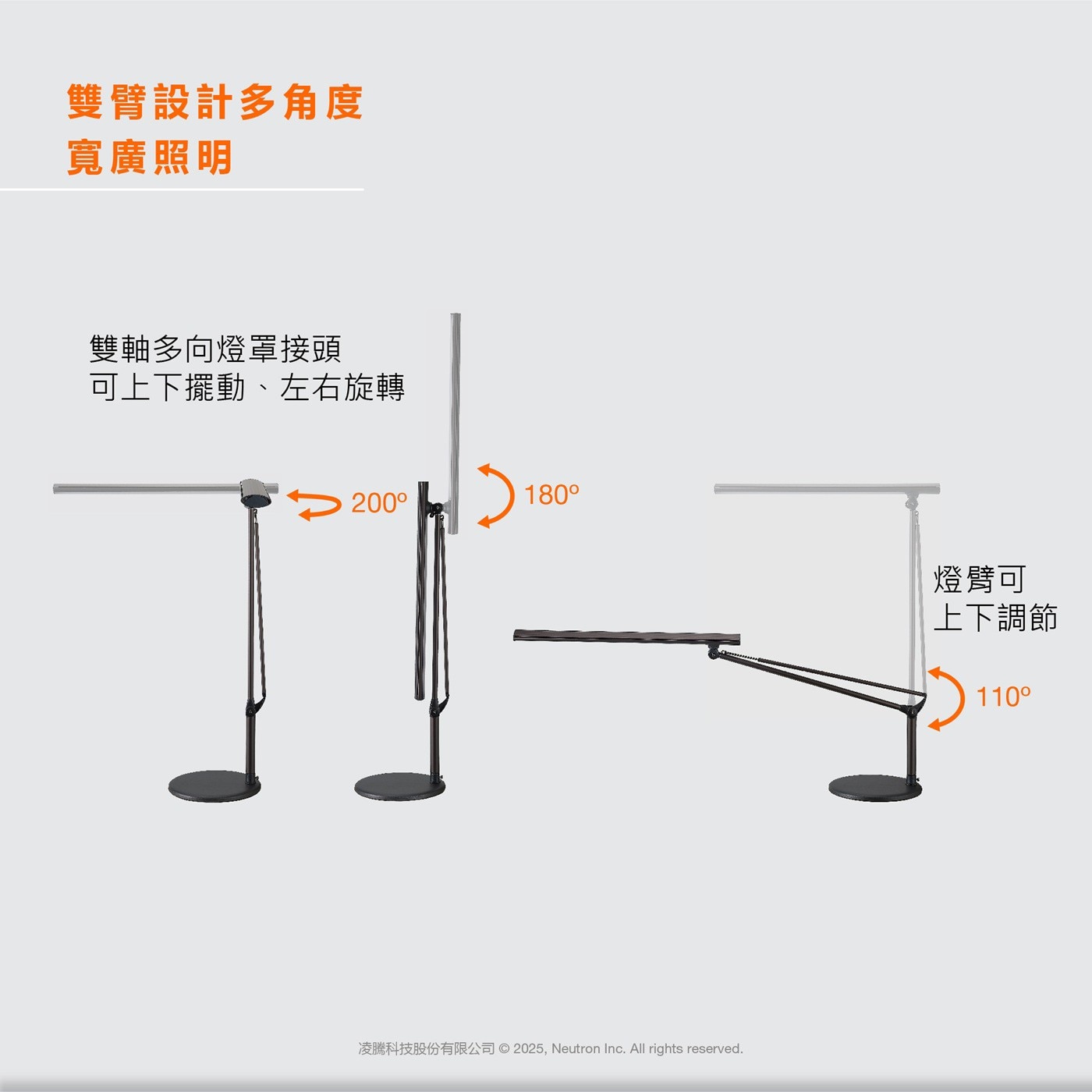 - 雙軸多項靈活接頭,搭配42公分寬燈罩,照射面寬達120公分