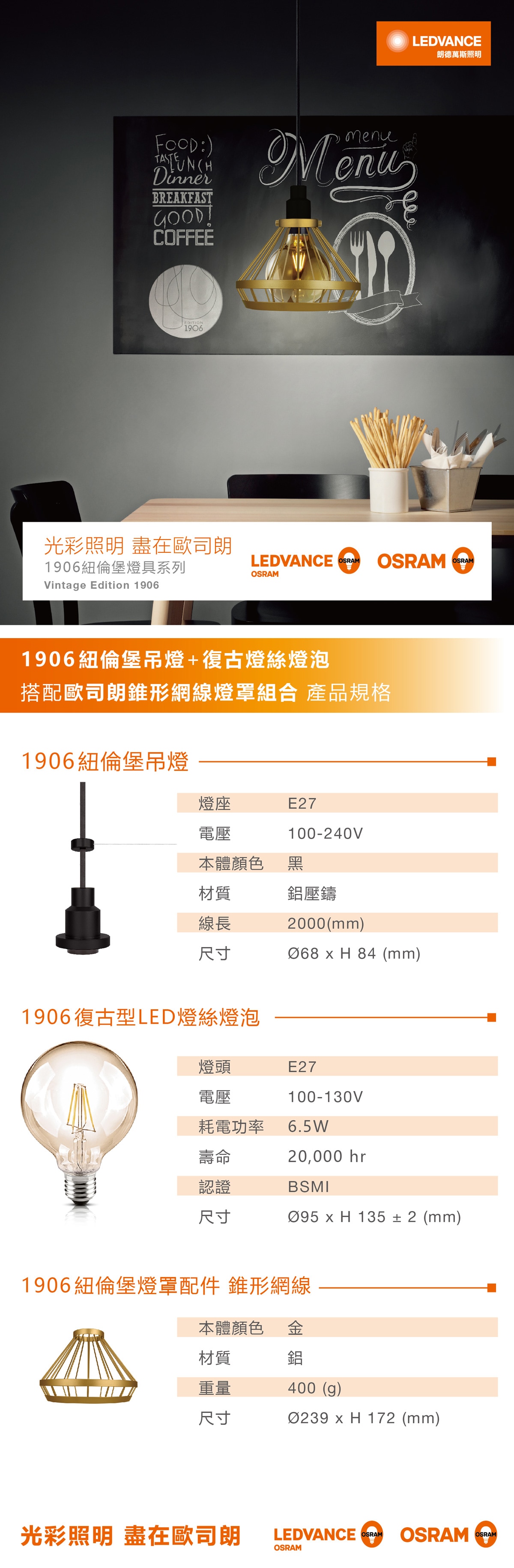 - 內含:紐倫堡燈頭*1、歐司朗6.5W LED燈絲燈*1、錐形網狀燈罩*1