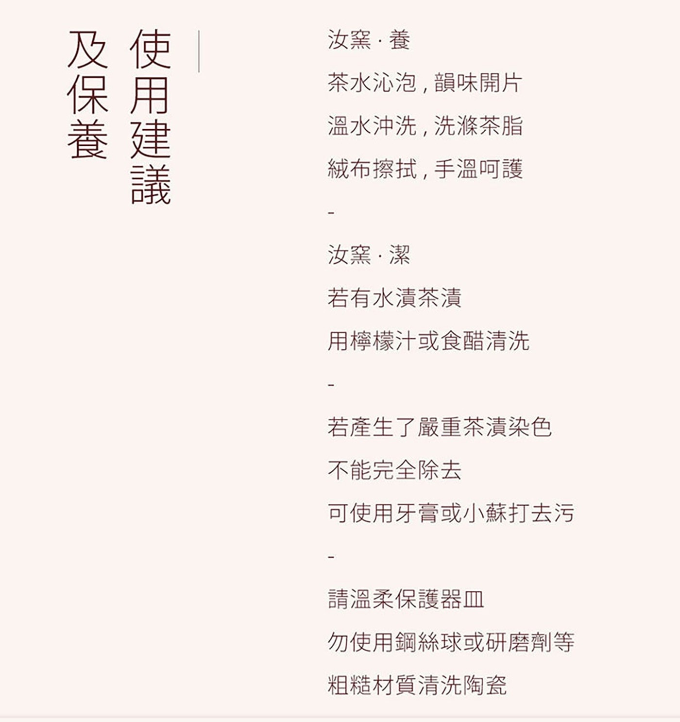 | 注意事項 | 1. 汝窯.養:茶水沁泡,韻味開片,溫水沖洗,洗滌茶脂,絨布擦拭,手溫呵護 2. 汝窯·潔:若有水漬茶漬,用檸檬汁或食醋清洗。 3. 若產生了嚴重茶漬染色,不能完全除去,可使用牙膏或小蘇打去污。 4. 請溫柔保護器皿,勿使用鋼絲球或研磨劑等,粗糙材質清洗陶瓷。 5. 清洗乾淨後置於通風良好處。 6. 收納時需確認壺內內濕氣已全去除。 |