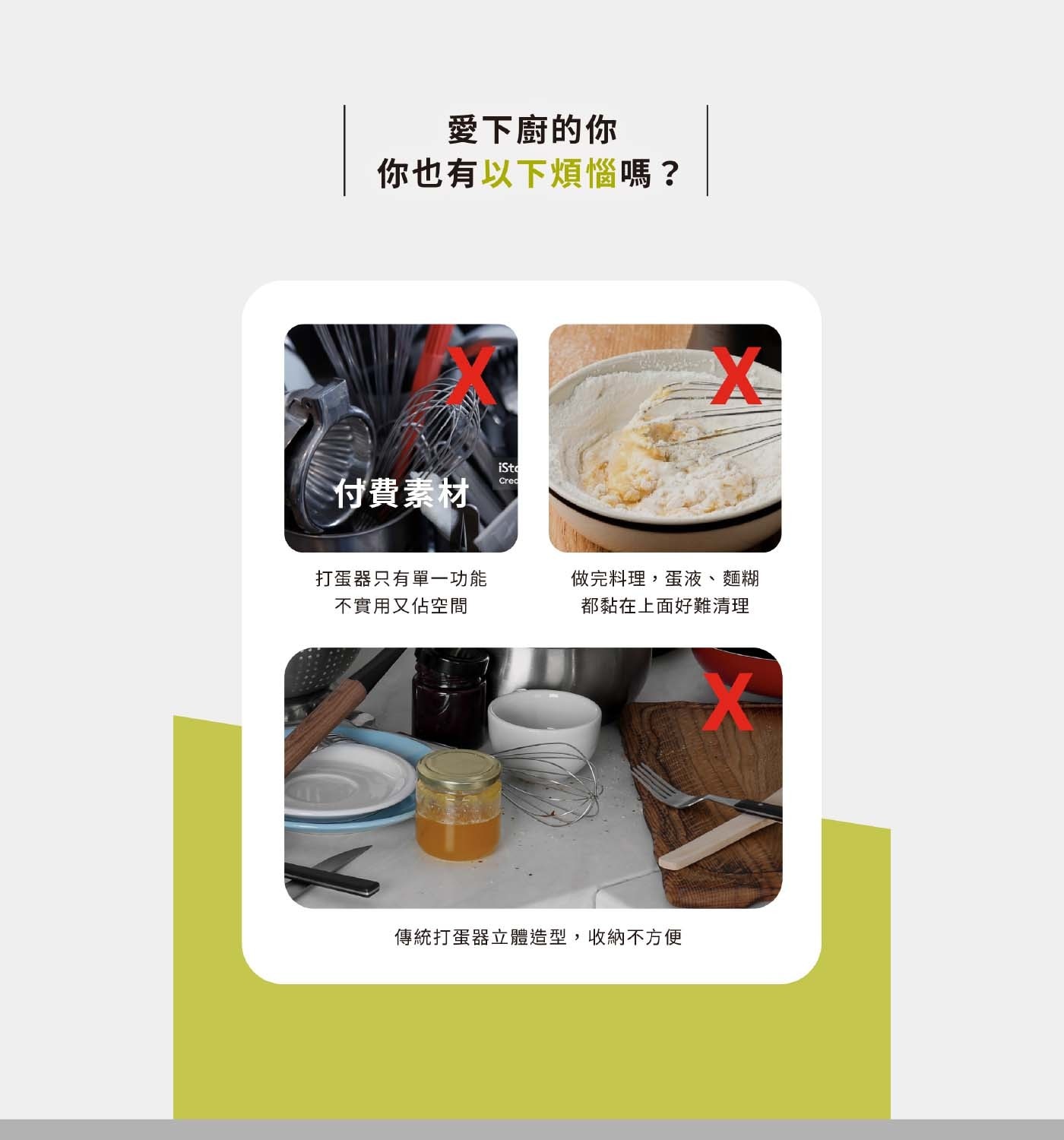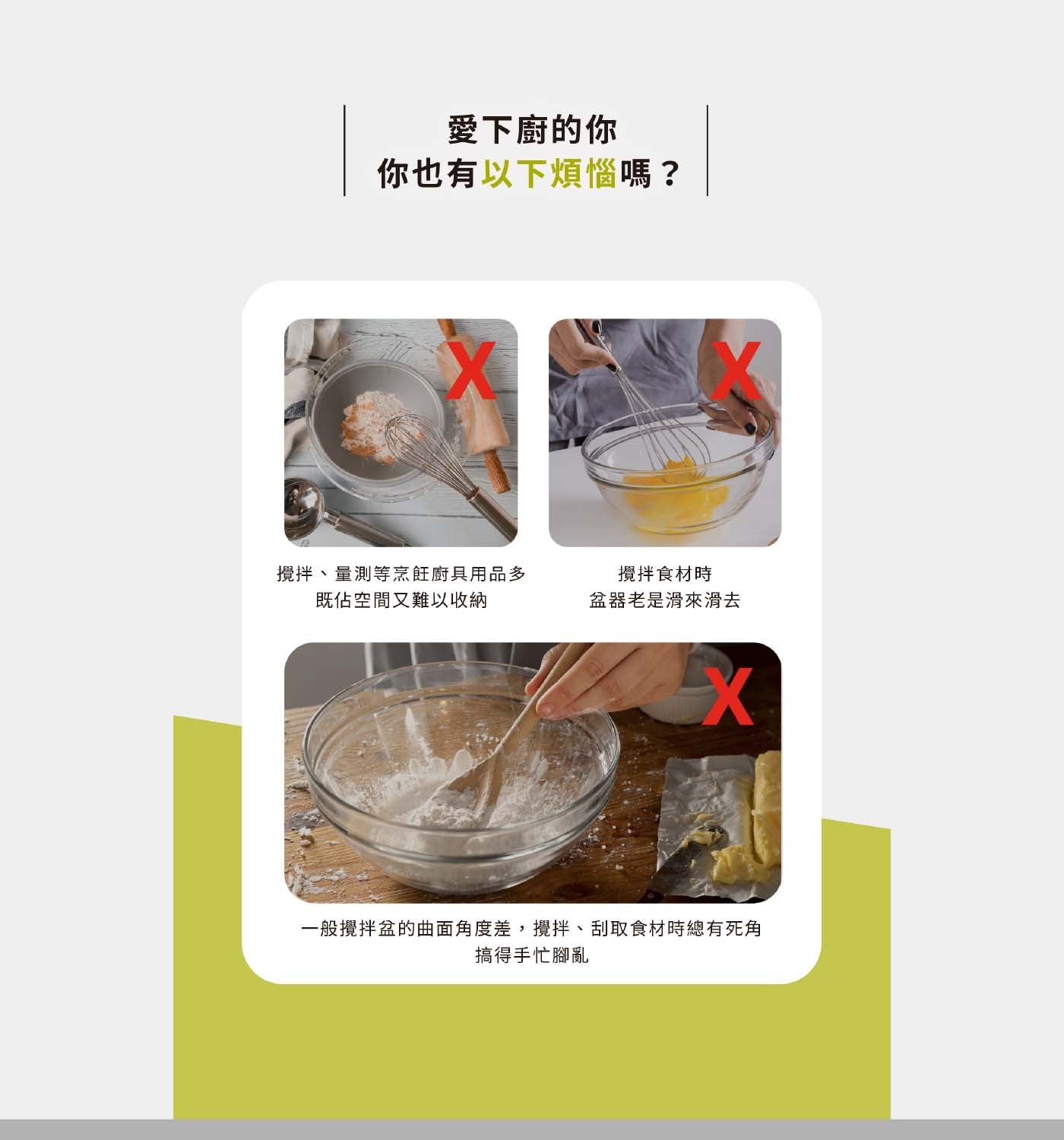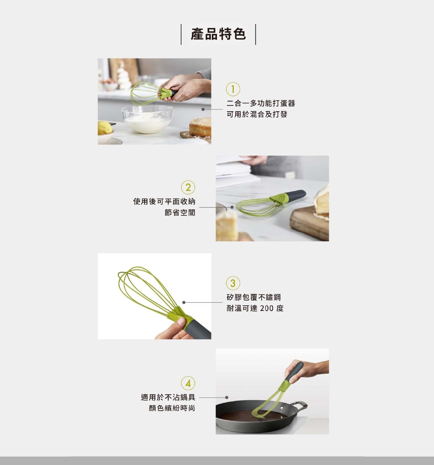 | 材質成分 | 量測盆、量匙 - PP (聚丙烯) (耐熱溫度70度C) 止滑底座 - TPE (熱塑性彈性體) 篩網 - 不鏽鋼 打蛋器 - PP(聚丙烯)、矽膠、不鏽鋼 (耐熱溫度200度C) |