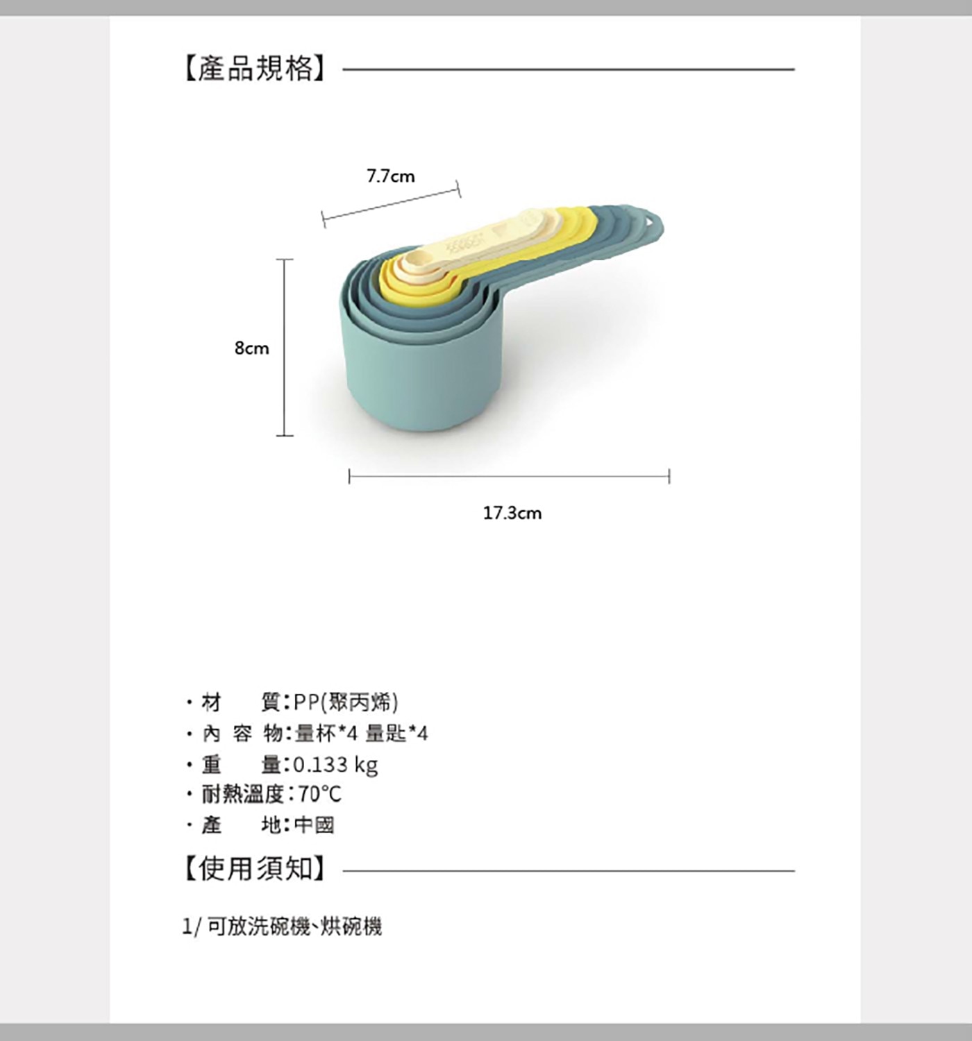 | 材質成分 | 鏟杓組 - PA(尼龍),耐熱溫度200度C 量匙組 - PP(聚丙烯),耐熱溫度70度C |
