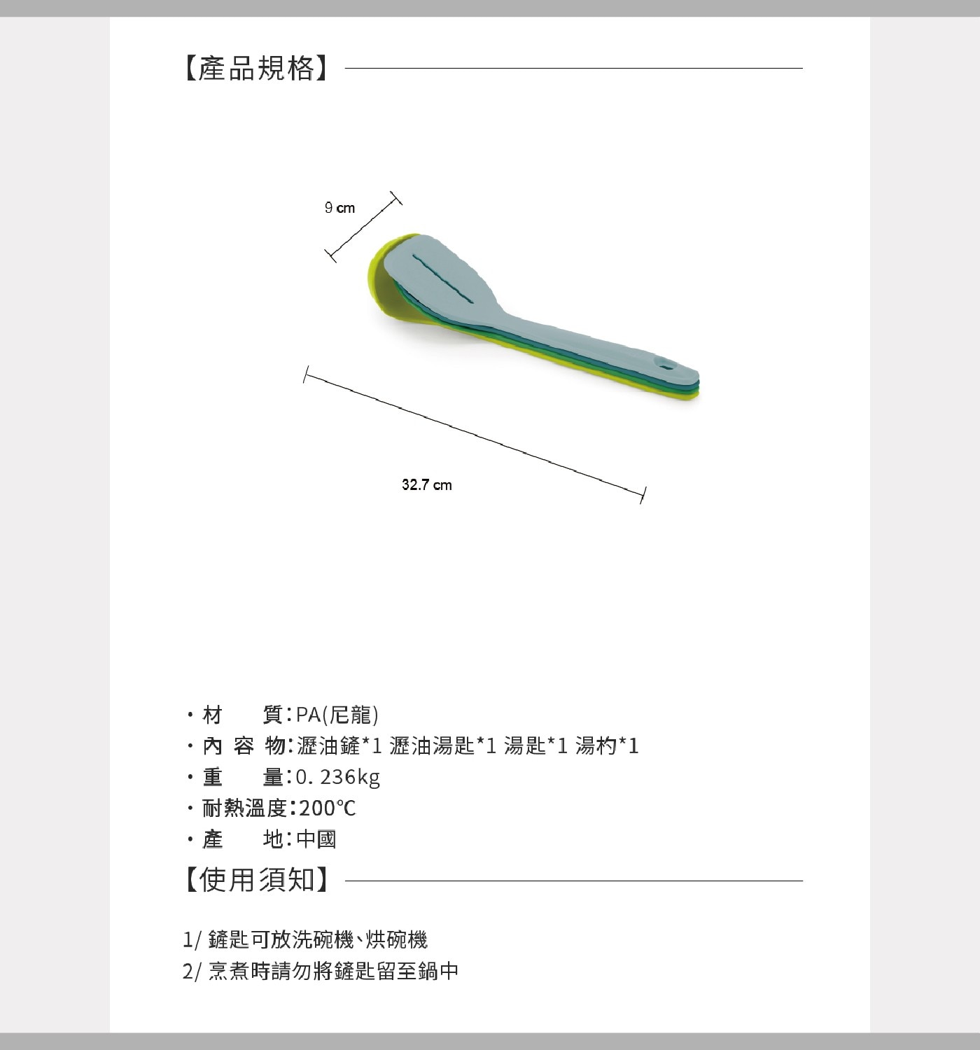 | 注意事項 | 1. 適用於洗碗機、烘碗機,溫度請勿超過70度。 2. 烹煮時請勿將鏟匙留至鍋中。 3. 使用完成請使用中性清潔劑洗滌或放入洗碗機清洗,並擦乾後保存,避免放置陽光直射處。 4. 供食品接觸用途。 5. 供重複使用。 |