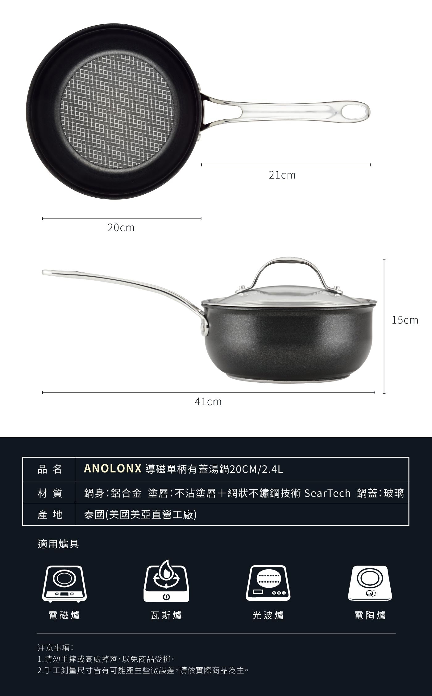 | 品名 | ANOLON ANOLON X SearTech 導磁不沾單柄湯鍋 含玻璃上蓋 20公分 |