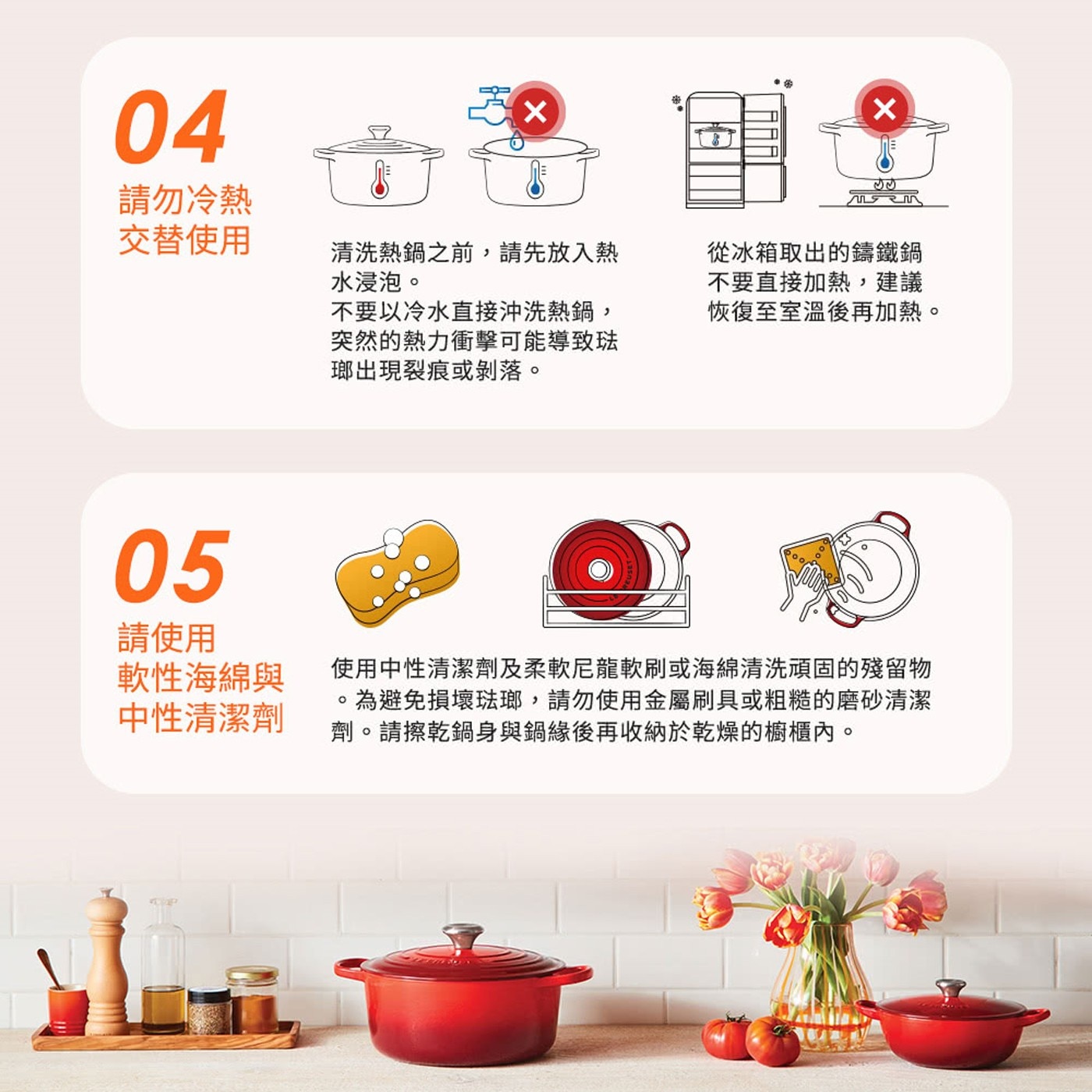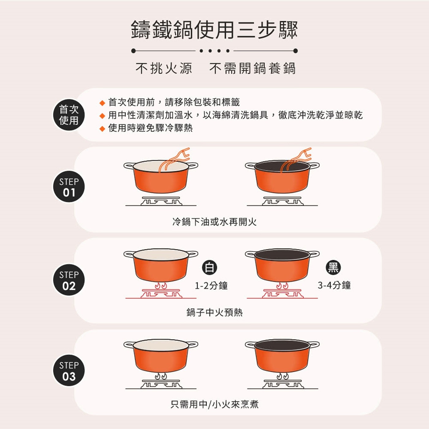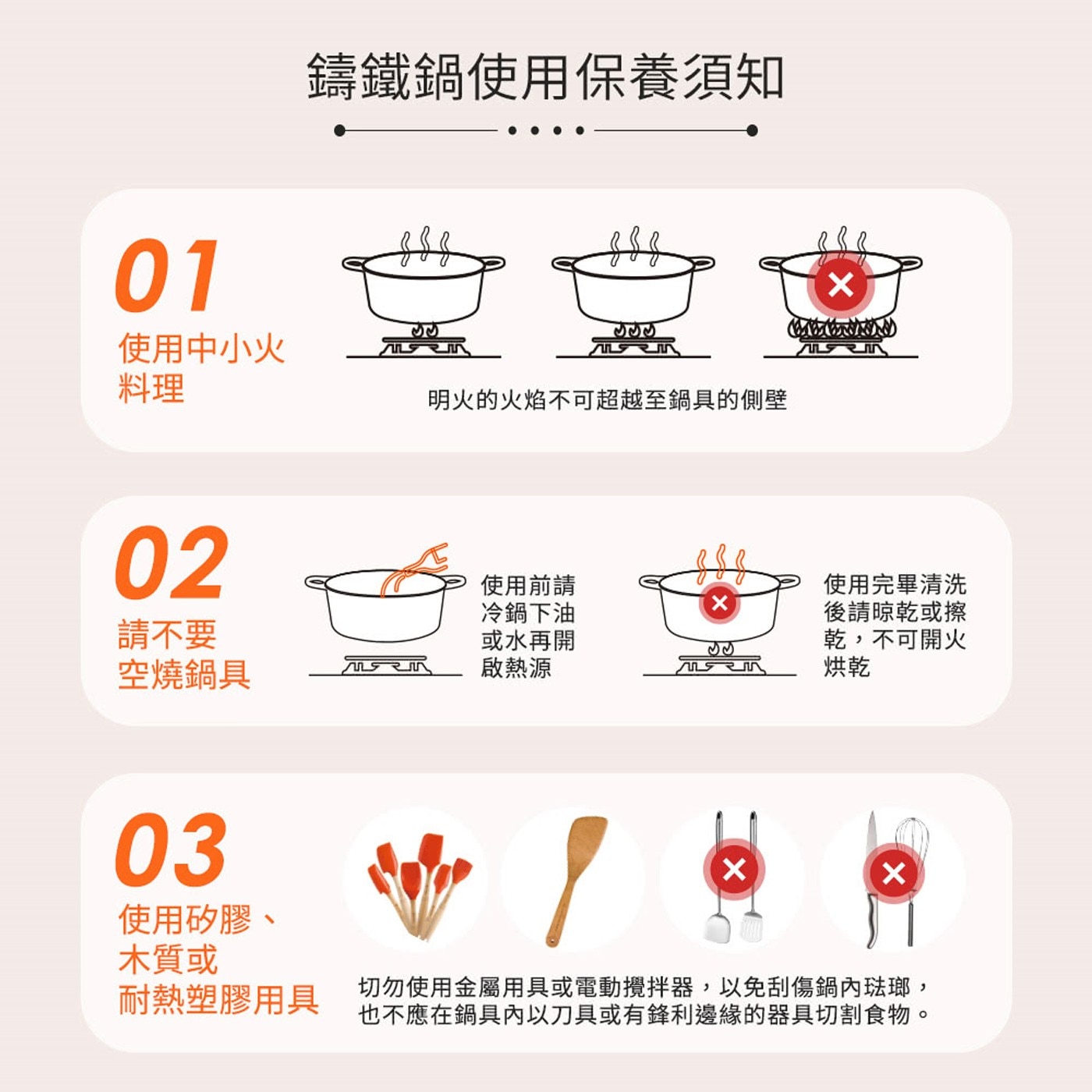 | 注意事項 | 1. 產品若有缺口、裂痕或刮損,請立即終止使用。 2. 烹飪前請完全擦乾鍋具後再放上爐具,以避免鍋身發黃。 3. 請避免商品空燒,並請使用中小火加熱。因為商品的把手也是由鑄鐵製成,因此加熱後熱能傳導會讓把手變熱。使用時請務必使用鍋把套等工具。 4. 適用於瓦斯爐、電磁爐、電陶爐、感應爐、烤箱烤肉爐。 5. 不適用於微波爐。 6. 開火加熱前請充分確認鍋具沒有出現傾斜等狀況後再行使用。 7. 請勿將加熱後的產品直接擺放於桌面上,建議以隔熱墊保護,避免造成桌面損壞。使用時請配戴隔熱手套,以免燙傷。 8. 建議不要使用不鏽鋼等金屬製湯杓或攪拌匙等工具,可能會在商品上留下金屬痕(銀色線狀痕)。 9. 勿用鐵刷、菜瓜布或有腐蝕性清潔劑。 10. 鍋具需冷卻15分鐘後才可用冷水清洗。 11. 請避免用力摩擦、使用銳利的器具。 12. 即使在其耐熱溫度範圍內,急遽的溫度變化亦會導致琺瑯破損,使用時請注意。 13. 本產品因製作方式與材質特性,色澤、尺寸有些微差異,表面小黑點、釉面上小氣孔、釉色些微不均勻,為正常現象,非產品瑕疵。 |