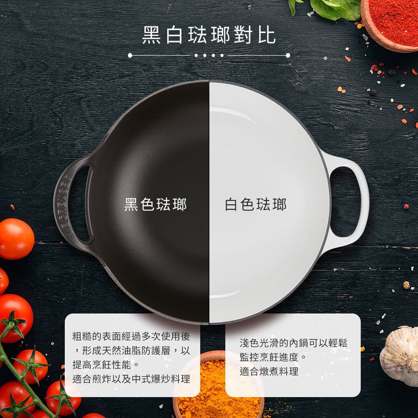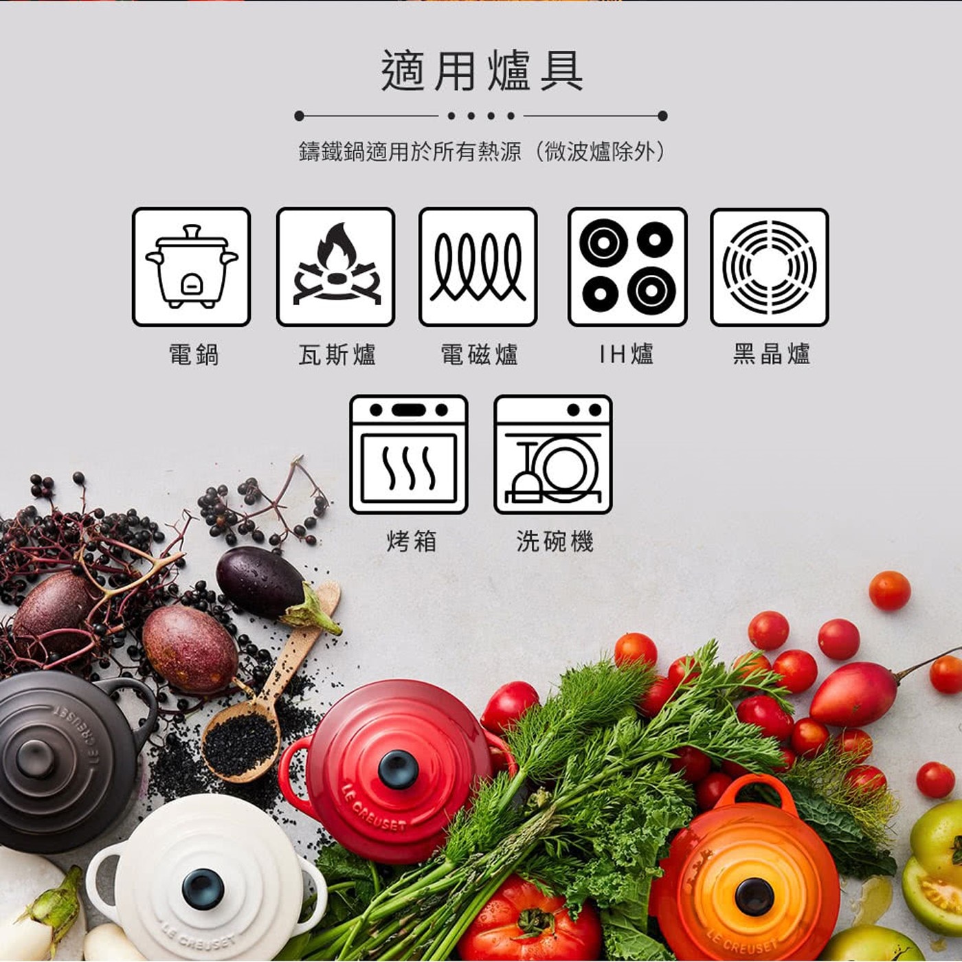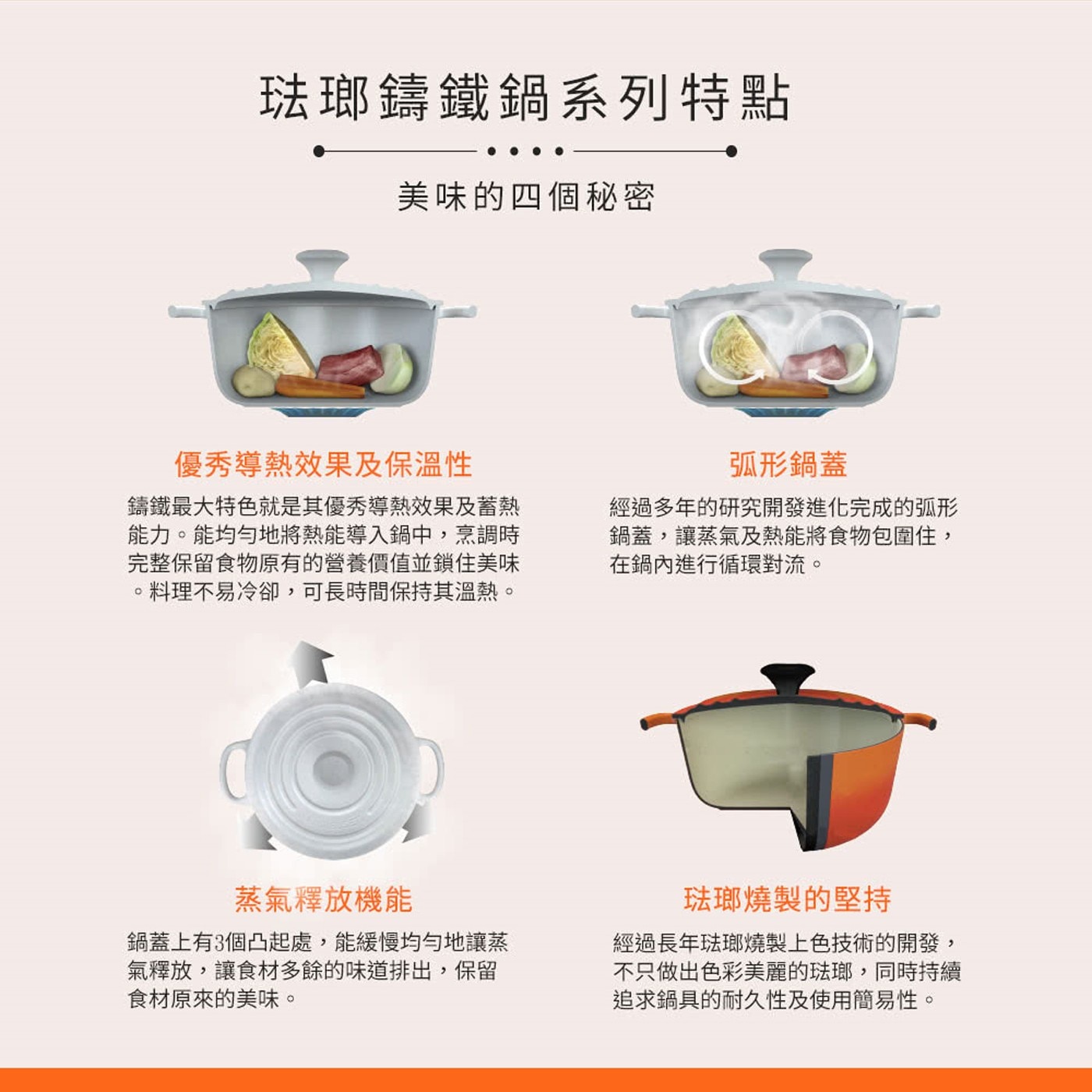 | 注意事項 | 1. 產品若有缺口、裂痕或刮損,請立即終止使用。 2. 烹飪前請完全擦乾鍋具後再放上爐具,以避免鍋身發黃。 3. 請避免商品空燒,並請使用中小火加熱。因為商品的把手也是由鑄鐵製成,因此加熱後熱能傳導會讓把手變熱。使用時請務必使用鍋把套等工具。 4. 適用於瓦斯爐、電磁爐、電陶爐、感應爐、烤箱烤肉爐。 5. 不適用於微波爐。 6. 開火加熱前請充分確認鍋具沒有出現傾斜等狀況後再行使用。 7. 請勿將加熱後的產品直接擺放於桌面上,建議以隔熱墊保護,避免造成桌面損壞。使用時請配戴隔熱手套,以免燙傷。 8. 建議不要使用不鏽鋼等金屬製湯杓或攪拌匙等工具,可能會在商品上留下金屬痕(銀色線狀痕)。 9. 勿用鐵刷、菜瓜布或有腐蝕性清潔劑。 10. 鍋具需冷卻15分鐘後才可用冷水清洗。 11. 請避免用力摩擦、使用銳利的器具。 12. 即使在其耐熱溫度範圍內,急遽的溫度變化亦會導致琺瑯破損,使用時請注意。 13. 本產品因製作方式與材質特性,色澤、尺寸有些微差異,表面小黑點、釉面上小氣孔、釉色些微不均勻,為正常現象,非產品瑕疵。 |