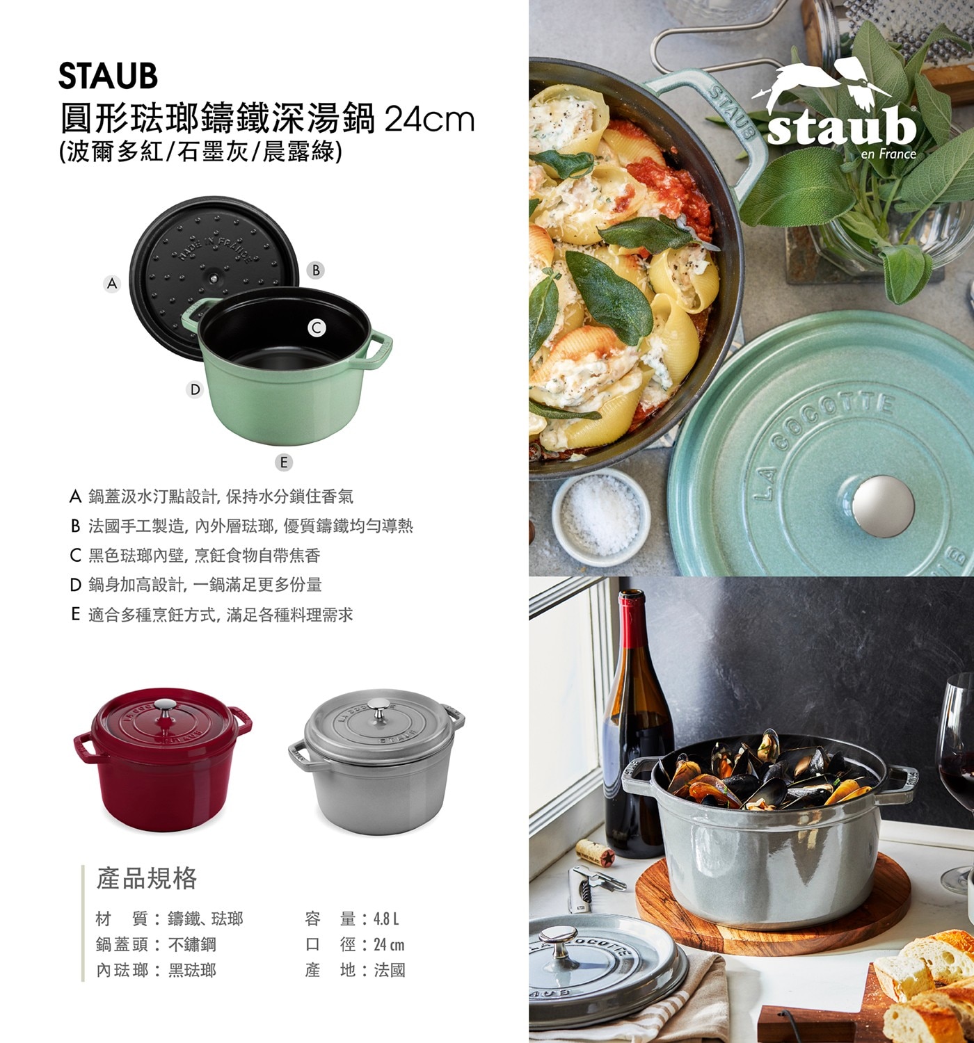 Staub 雙耳圓形鑄鐵深湯鍋 含鋼頭鍋蓋 24公分 晨露綠