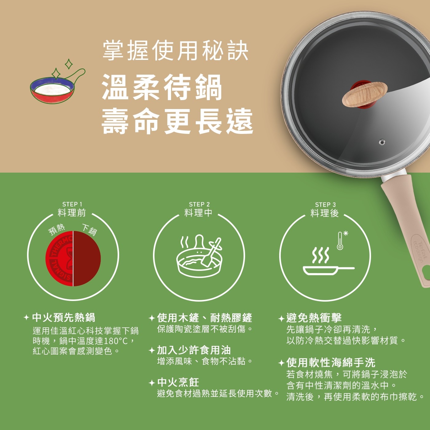 注意事項 | 1. 本產品請勿乾燒。 2. 移動或提起湯鍋時,請務必使用隔熱墊。 3. 請將湯鍋置於尺寸相匹配的爐架上使用。 4. 適用於適用於IH爐、瓦斯爐、電磁爐、鹵素爐、電陶爐。 5. 不建議使用不鏽鋼鍋鏟。 6. 清潔時請鍋背先沖水。 7. 清潔鍋具時,建議使用海綿。 |
