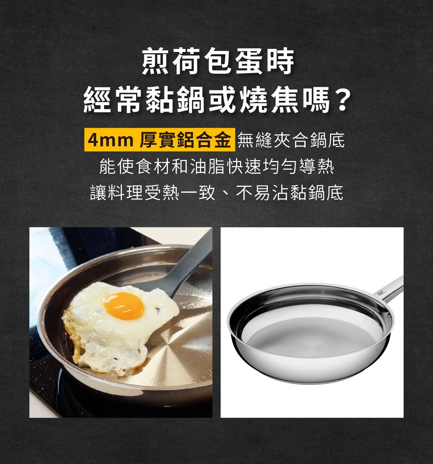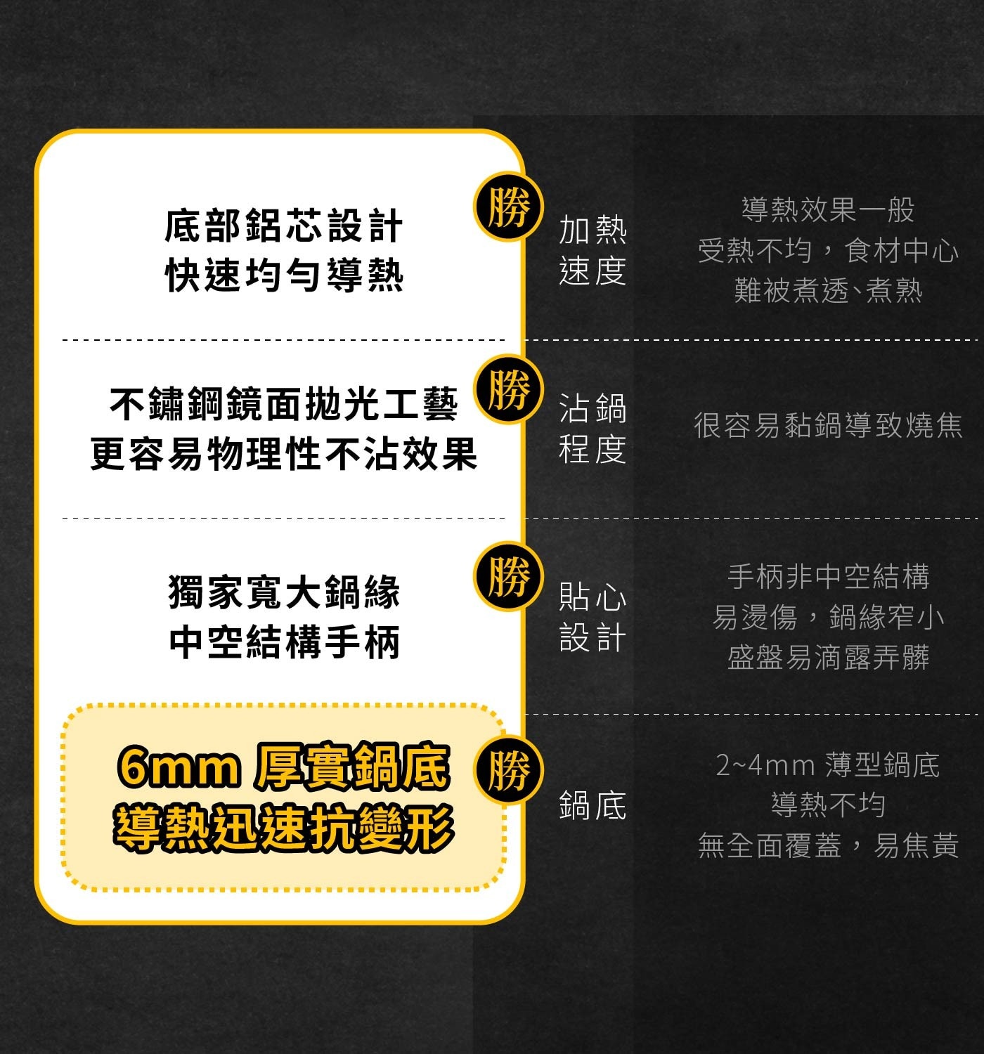 - 6mm厚實鍋底,讓食材緊貼鍋面、均勻受熱