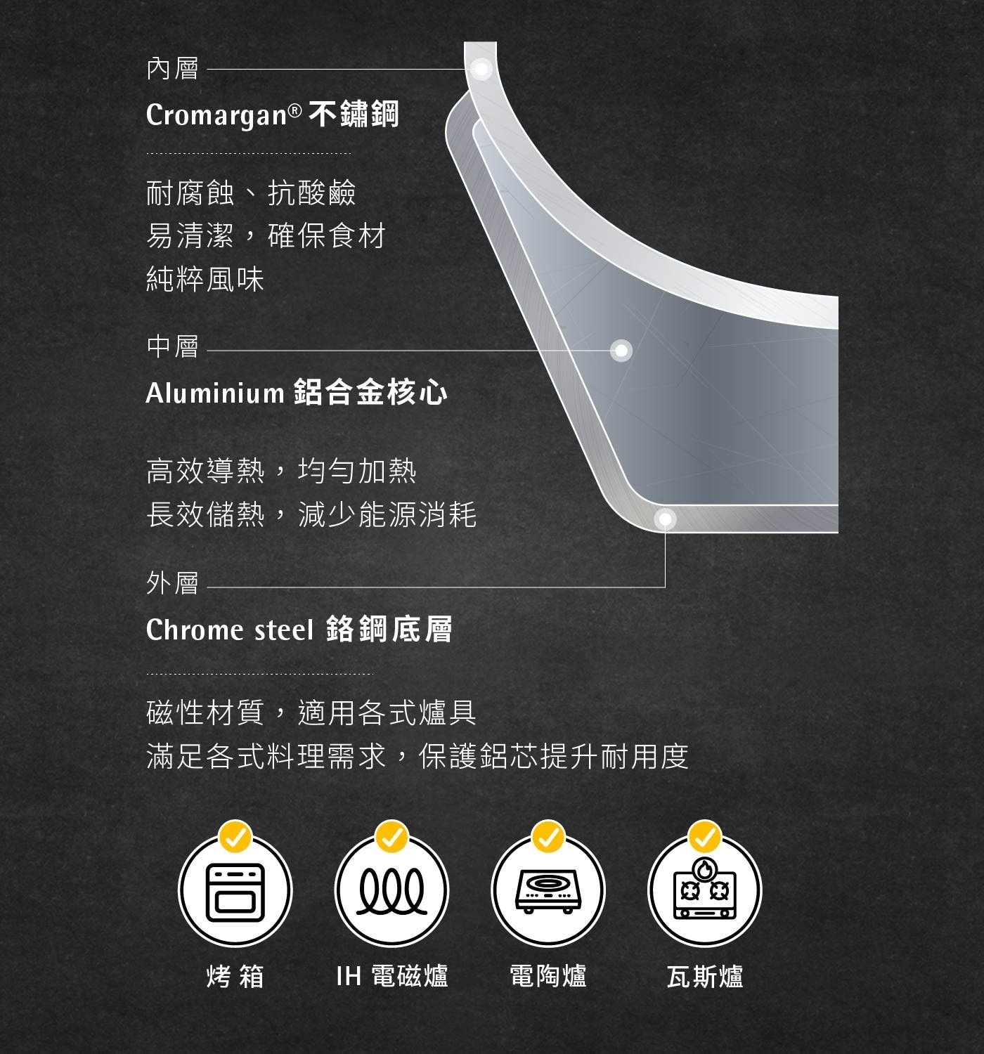 - TransTherm® 通用鍋底,蓄熱性佳、導熱快速均勻