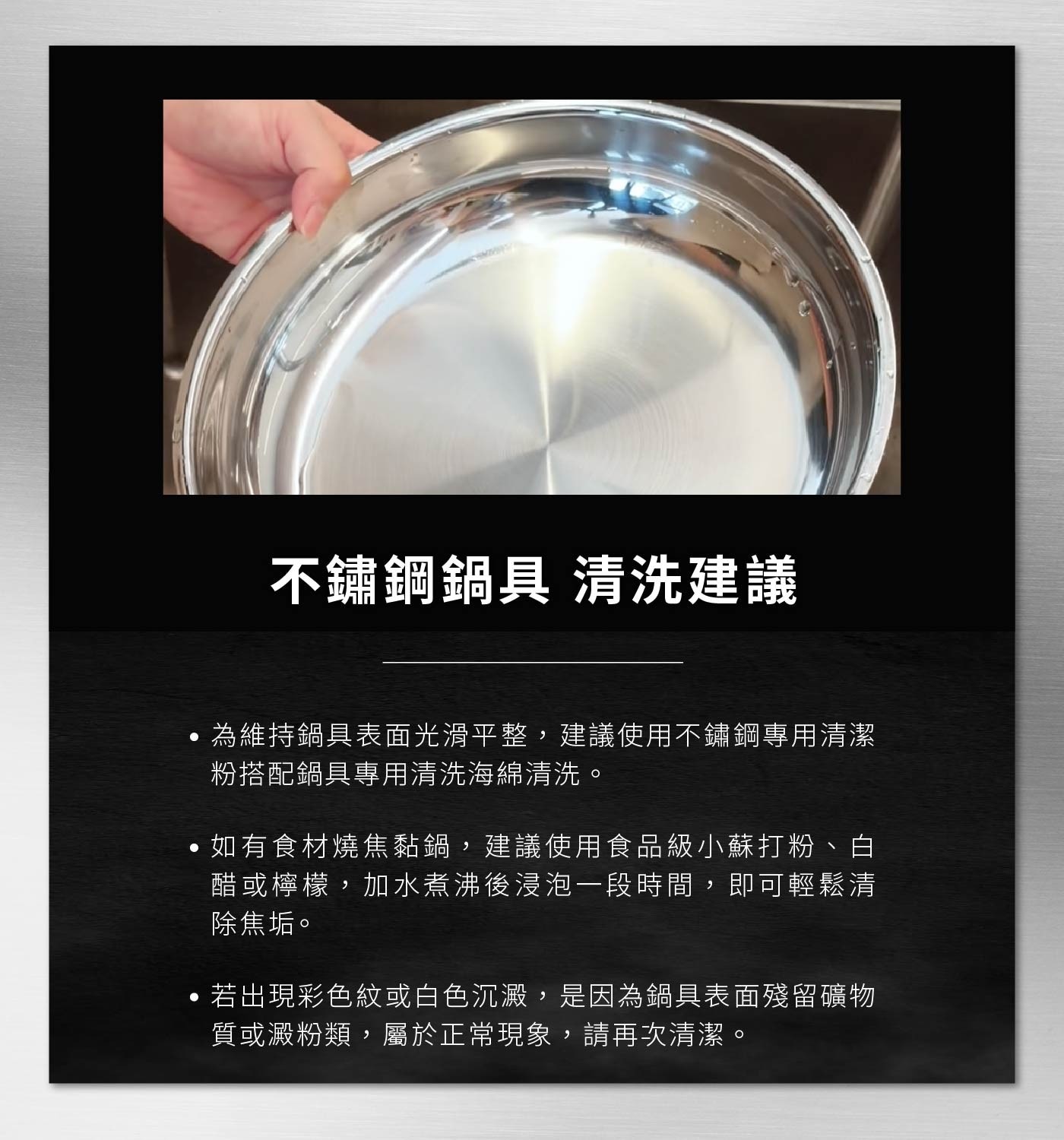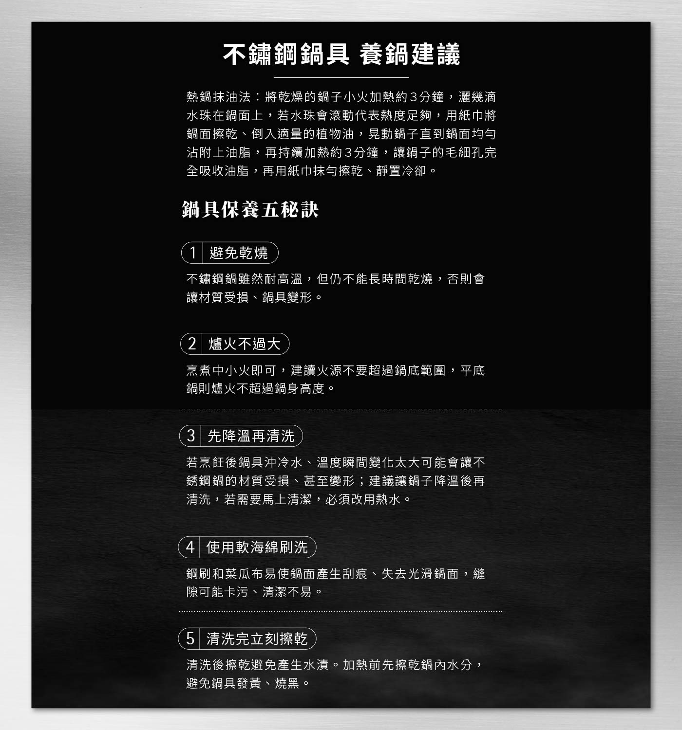 | 注意事項 | 1. 首次使用前,請去除鍋身上所有貼紙,並用水煮沸清洗三次。 2. 切勿長時間空燒平底鍋,並注意不可完全燒乾食物湯汁。如不遵守,易導致鍋具或爐具損壞。 3. 使用中火或小火即可獲得最佳效果,僅熱鍋時使用最大火力,之後應及時調低火力,多層結構設計能快速均勻加熱並分佈至鍋沿,控制火苗不超出鍋底範圍避免鍋邊油漬燒焦。 4. 可直接整鍋入烤箱烘烤,最高耐熱溫度達250度。進入烤箱烘烤後請留意鍋身與把手高溫,務必使用防燙手套。 5. 長時間過熱狀態下,可能會導致鍋具材料變色。此變化純屬外觀性質,不會對烹飪品質造成任何影響。 6. 小心高溫油脂灼傷。 7. 切勿讓燒熱的鍋具無人看管,尤其是放置於兒童易取得之處。 8. 當油脂著火時切勿用水滅火。請使用浸濕的厚毯或滅火器。 9. 使用後可先使用溫水將附著的油垢醬汁或食物殘渣泡軟,再使用海綿或毛刷清洗。 10. 清洗時不得使用鋼絲球或含砂型去污劑。 11. 請避免堅硬、尖銳和金屬製成的廚具在鍋沿上用力敲擊。這可能會對鍋具造成損害。 12. 使用後如有附著食物殘渣請先用溫水泡軟,然後用海綿或毛刷輕輕將其擦除, 不得使用鋼絲球或含砂型去污劑,後將後將鍋具充分擦乾存放。 13. 使用洗碗機清洗結束後儘快敞開洗碗機通風,儘快從洗碗機中取出鍋具,不要讓其長時間處於潮濕環境下,否則可能產生水漬,後將鍋具充分擦乾存放。 |